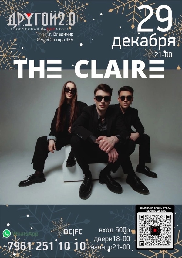 Концерты во Владимире Группа «The Claire»29 декабря 2024 в 21:00 Сольный концерт «The Claire» в Другом Баре 2.0. Стоимость билета: 500 р. Билеты на входе INFO / RESERVE / WhatsApp +7 961 251 1010 https://drugoy-bar.restoplace.ws/ Дата: 29 декабря 2024 Двери: с 18.00 Начало: в 21.00 Место проведения: Другой Бар 2.0 Информация с https://vk.com/the_claire « вернуться владимирская афиша другие концерты во Владимире |