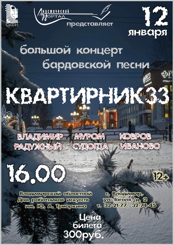 Концерты во Владимире Концерт авторской песни «Квартирник33»12 января 2025 в 16:00 12 января приглашаем на концерт авторской песни в Областной дом работников искусств. «Квартирник-33» — это традиционная встреча авторов и исполнителей песен под гитару, которую организует музыкально-поэтический проект «Акустический портал». Участники концерта представляют не только столицу нашего региона, но и исполнителей из других городов области. Вечер будет наполнен хорошей музыкой и стихами! Билеты в кассе ОДРИ на Гоголя, 2, купить их можно заранее и перед входом на мероприятие! Цена билета: 300 руб. Дата: 12 января 2025 Начало: в 16.00 Место проведения: Владимирский областной Дом работников искусств Адрес: г. Владимир, ул. Гоголя, 2 Тел.: +7 (4922) 32-21-77 Информация с https://vladodri.ru/events/bolshoj-koncert-avtorskoj-pesni-kvartirnik33/ « вернуться владимирская афиша другие концерты во Владимире |