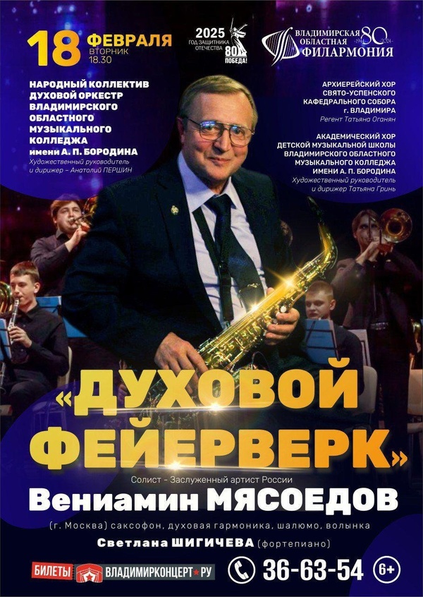 Концерты во Владимире «ДУХОВОЙ ФЕЙЕРВЕРК»18 февраля 2025 в 18:30 18 февраля во Владимирской областной филармонии состоится концерт "Духовой фейерверк". Солист - Заслуженный артист России Вениамин МЯСОЕДОВ (г. Москва). Вениамин Мясоедов — уникальный музыкант-мультиинструменталист, "человек-оркестр". Он владеет игрой на духовых инструментах разных эпох и народностей, что считается большой редкостью в музыкальной среде. На них маэстро играет поочередно, всегда изумляя публику. Среди его инструментов на обывательском слуху саксофон и шотландская волынка. Остальные – сплошь этническая экзотика: шалюмо, окарина, жалейка, свирель и другие. В концерте принимают участие: - Народный коллектив ДУХОВОЙ ОРКЕСТР Владимирского областного музыкального колледжа имени А. П.Бородина, художественный руководитель и дирижер – Анатолий Першин - Академический хор Детской музыкальной школы Владимирского областного музыкального колледжа имени А. П. Бородина, Художественный руководитель и дирижер Татьяна Грин - Архиерейский хор Свято-Успенского Кафедрального собора г. Владимира, регент Татьяна ОганянХудожественный руководитель и дирижер – Анатолий Першин. В программе: произведения советских, российских и зарубежных композиторов Продолжительность концерта: 1,5 часа Цена билета: 500 руб. Билеты по ссылкам: https://iframeab-pre10088.intickets.ru/seance/47605609/ https://vladimirkoncert.ru/shows/event/8347-DUKHOVOI-FEIERVERK Дата: 18 февраля 2025 Начало: в 18.30 Место проведения: Владимирская областная филармония Адрес: г. Владимир, пр-т Ленина, д. 1 Телефон кассы: 8 (4922) 36-63-54 Информация с https://old.vladfilarmonia.ru/events/indexd1c8.html?news=2192 « вернуться владимирская афиша другие концерты во Владимире |