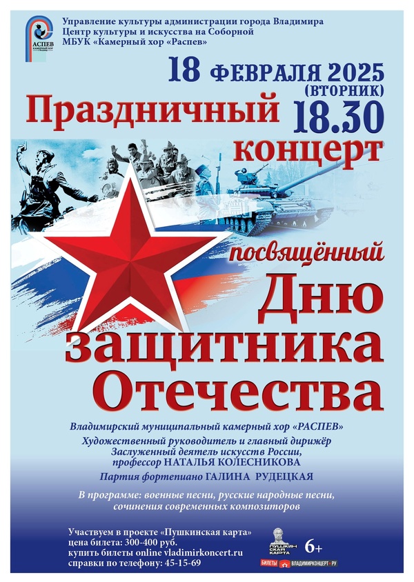 Концерты во Владимире «ПРАЗДНИЧНЫЙ КОНЦЕРТ»18 февраля 2025 в 18:30 Дню защитника Отечества посвящается Во все времена защитники отечества вызывали чувство особой гордости. И сегодня защищать родную землю - почётный труд. Безусловно, опасный, но, государственно необходимый. "Есть такая профессия - Родину защищать!" Для многих наших сограждан и сегодня это не пустые слова. Именно благодаря таким людям мы имеем возможность строить свою жизнь, семью, выбирать дело по душе, быть уверенными в будущем своих детей. Испокон века эту сложную профессию воспевали все виды и жанры искусства. Музыке была отведена особая роль. Она, как уникальный вид искусства, даже в самые сложные для Родины времена могла вернуть силы, вселить веру, поднять боевой дух. Вспомните хотя бы гимн Великой Отечественной! Но, она могла и смягчить охваченные горем сердца и утешить скорбящие души. Грядущий концерт обещает быть таким разговором - сильным, бравурным и трепетным одновременно. С любовью и уважением к вам, дорогие защитники нашего отечества, прозвучит этот концерт! Билеты по ссылке: https://vk.cc/cIj0Jp Действует Пушкинская карта Дата: 18 февраля 2025 Начало: в 18.30 Место проведения: Центр культуры и искусства на Соборной Адрес: г. Владимир, ул. Большая Московская, 33/35 Информация с https://vk.com/wall-30929449_3833 « вернуться владимирская афиша другие концерты во Владимире |