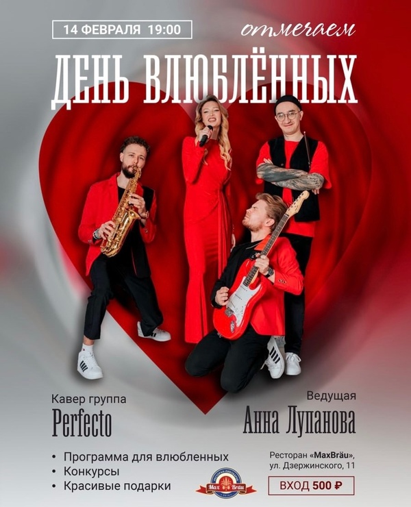 Концерты во Владимире День влюбленных в Макс Брой14 февраля 2025 в 19:00 День святого Валентина в MaxBrau! Миром правит любовь, празднуйте ЛЮБОВЬ с нами!Пусть романтика этого прекрасного дня коснется каждого из вас! Вас ждут - романтическая атмосфера- песни про любовь - головокружительные танцы - конкурсы с призами -специальные подарки для всех влюблённых! Кавер-группа "Perfecto" Ведущая - Анна Лупанова Вход 500 руб. Забронировать стол: +79190112841maxbrau33.restoplace.ws Дата: 14 февраля 2025 Начало: в 19.00 Место: ресторан Макс Брой Адрес: г. Владимир. ул. Дзержинского, д. 11, 2 этаж Информация с https://vk.com/wall-77563659_18932 « вернуться владимирская афиша другие концерты во Владимире |