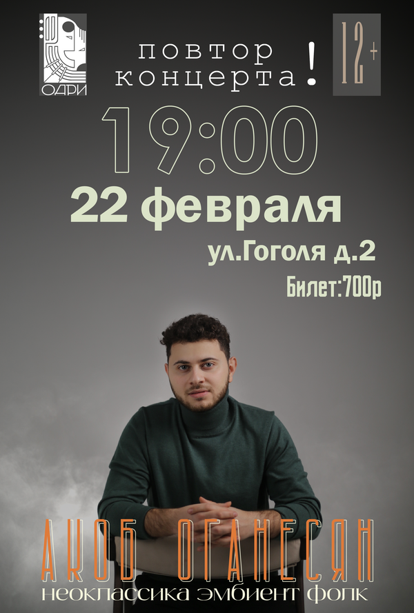 Концерты во Владимире Сольный концерт Акоба Оганесяна22 февраля 2025 в 19:00 Повтор концерта Акоб Оганесян — талантливый пианист и композитор из Владимира. Уникальный стиль и интересные аранжировки делают каждое выступление музыканта по-настоящему запоминающимся. В рамках сольного концерта в областном доме работников искусств прозвучат фольклорные мотивы, классические произведения, электронная музыка и джазовые импровизации. В концерте примут участие друзья Акоба — яркие музыканты города, что сделает это событие еще более насыщенным и разнообразным. Не упустите возможность погрузиться в мир музыки, которая трогает душу! Цена билета: 700 руб. Билеты по ссылке: https://vmuzey.com/event/solnyy-koncert-akoba-oganesyana-2 Дата: 22 февраля 2025 Начало: в 19.00 Место проведения: Владимирский областной Дом работников искусств Адрес: г. Владимир, ул. Гоголя, 2 Тел.: +7 (4922) 32-21-77 Информация с https://vladodri.ru/events/1294/ « вернуться владимирская афиша другие концерты во Владимире |