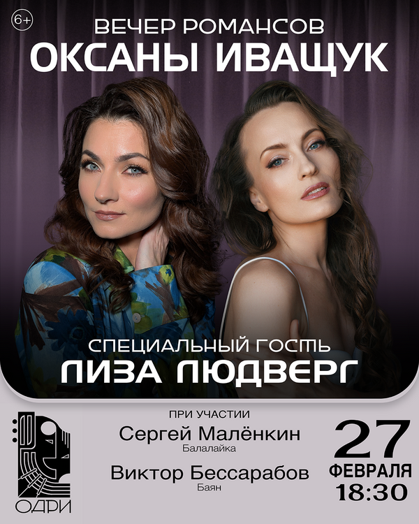 Концерты во Владимире Вечер романсов с Оксаной Иващук27 февраля 2025 в 18:30 Приглашаем вас отдохнуть душой и прикоснуться к прекрасному на вечере романсов от Оксаны Иващук! Искренность и простота, многогранность и сложность любви откроются вам….. Оторвитесь от обыденного, позвольте себе погрузиться в глубокий и таинственный мир романса! Специальный гость: Лиза Людверг — автор-исполнитель из города Владимира. Музыкой занимается с детства, но писать песни начала в 2022-м году, в качестве своеобразной терапии от личных переживаний. Сама автор-исполнитель определила свой стиль, как современный городской романс, но пробует себя в разных направлениях. Только живой голос, фортепиано и личная история. При участии: Сергей Малёнкин — балалайка Виктор Бессарабов – баян Цена билета: 800 руб. Билеты по ссылке: https://vmuzey.com/event/vecher-romansov-s-oksanoy-ivashchuk Дата: 27 февраля 2025 Начало: в 18.30 Место проведения: Владимирский областной Дом работников искусств Адрес: г. Владимир, ул. Гоголя, 2 Тел.: +7 (4922) 32-21-77 Информация с https://vladodri.ru/events/vecher-romansov-s-oksanoj-ivashhuk/ « вернуться владимирская афиша другие концерты во Владимире |