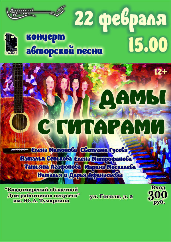 Концерты во Владимире Концерт авторской песни «Дамы с гитарами»22 февраля 2025 в 15:00 22 февраля в 15-00 ждём вас в ОДРИ на концерте авторской песни — на сцене будут исключительно дамы — прекрасные, поющие, сочиняющие, с гитарами в руках. Очередная встреча проекта «Акустический портал» приурочена и посвящена героическим защитникам нашего Отечества, то есть мужчинам. В программе: песни и стихи о волнующем собственного сочинения и избранная бардовская классика. Приходите, и вы не пожалеете времени, которое пройдёт мимолётно и на одном дыхании. На концертах «Акустического портала» всё и всегда на одном дыхании! Цена билета: 300 руб. Дата: 22 февраля 2025 Начало: в 15.00 Место проведения: Владимирский областной Дом работников искусств Адрес: г. Владимир, ул. Гоголя, 2 Тел.: +7 (4922) 32-21-77 Информация с https://vladodri.ru/events/damy-s-gitarami-koncert-proekta-akusticheskij-portal/ « вернуться владимирская афиша другие концерты во Владимире |