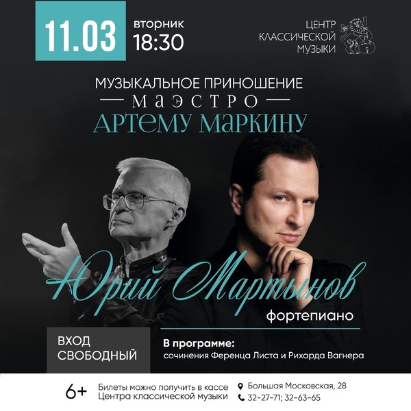 Концерты во Владимире Музыкальное приношение маэстро Артёму Маркину. Юрий Мартынов (фортепиано)11 марта 2025 в 18:30 Юрий Мартынов (фортепиано, клавесин, хаммерклавир, клавикорд, орган) принадлежит к числу наиболее интересных и разносторонних российских музыкантов наших дней, чьё исполнительское искусство соединяет лучшие традиции русской фортепианной и западноевропейской клавирной школ с неповторимой личностностью. В мире насчитываются единицы исполнителей в равной степени в совершенстве владеющих таким количеством инструментов и стилей. В программе концерта музыка Ференца Листа и Рихарда Вагнера. ВХОД ПО БЕСПЛАТНЫМ БИЛЕТАМ Бесплатные билеты можно получить в кассе Центра классической музыки по адресу: ул. Большая Московская, 28 Дата: 11 марта 2025 года Начало: в 18:30Место: Центр классической музыки Телефоны для справок: 8 (4922) 32-27-71; 32-63-65 Информация с https://www.vgso.ru/?menu=concert&number=1005 « вернуться владимирская афиша другие концерты во Владимире |