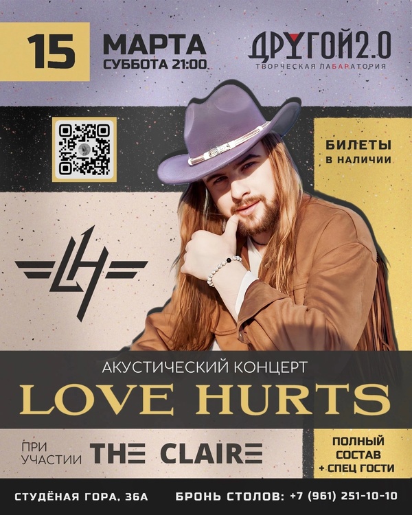 Концерты во Владимире LOVE HURTS15 марта 2025 в 20:00 LOVE HURTS 15.03.2025 Владимир Другой Бар 2.0 - акустическая программа - презентация актуального состава группы - новые треки - огромная доза удовольствия - крутые The Claire в саппорте - лучшие спец гости, что только можете себе нафантазировать Билеты по ссылке: https://glamer.timepad.ru/event/3271634/ Для брони столов пишите напрямую в бар +7 (961) 251-10-10 Дата: 15 марта 2025 Начало: в 20.00 Место проведения: Другой Бар 2.0 Адрес: Владимир, Студёная гора 36 А Информация с https://vk.com/concertlovehurts « вернуться владимирская афиша другие концерты во Владимире |