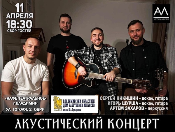 Концерты во Владимире Концерт фестиваля "АкусТика мЫслей"11 апреля 2025 в 18:30 Рады пригласить вас снова окунуться в атмосферу душевной акустической музыки и живого творчества на очередном концерте фестиваля АкусТика мЫслей, который проходит у нас в "Театральном" кафе по инициативе группы ИНОК_И. На этот раз у нас выступит группа талантливых музыкантов из города Меленки, объединенных общей идеей и стремлением создавать самобытную музыку. Труд и вдохновение музыкантов воплотились в ярких мелодиях, которые звучат искренне и проникновенно. Первый шаг к широкой аудитории был сделан с синглом «Над треугольниками крыш», который уже завоевал сердца многих слушателей. Приходите 11 апреля в 18.30 в "Театральное кафе" ОДРИ(нижний зал), чтобы насладиться настоящей живой музыкой и зарядиться позитивной энергией. Количество мест ограничено. Дата: 11 апреля 2025 Начало: в 18.30 Место проведения: Владимирский областной Дом работников искусств, кафе "Театральное" Адрес: г. Владимир, ул. Гоголя, 2 Информация с https://vk.com/wall-74230818_3547 « вернуться владимирская афиша другие концерты во Владимире |