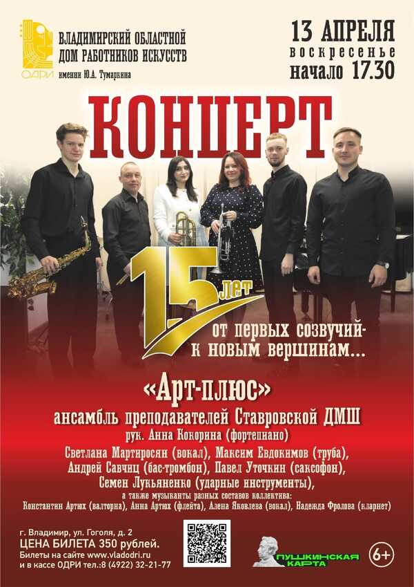 Концерты во Владимире Концерт преподавателей музыкальной школы «Арт-плюс»13 апреля 2025 в 17:30 На сцене Областного дома работников искусств состоится концерт ансамбля преподавателей Ставровской детской музыкальной школы «Арт-плюс». Для зрителей представят программу, состоящую из интересных аранжировок популярной вокальной и инструментальной музыки XX века. В исполнении музыкантов прозвучат такие произведения, как русская народная песня «Калинка», а также всем известные песни «Лучший город земли», «Черный кот». Программа коллектива уникальна тем, что каждое произведение пишется самими участниками ансамбля для данного состава духовых инструментов в сочетании с вокалом, поэтому даже самые знакомые композиции заиграют новыми необычными инструментальными красками. Ансамбль «Арт-плюс» был основан преподавателями детской музыкальной школы поселка Ставрово, которая известна своими талантливыми выпускниками духовиками. Ансамбль неоднократно выступал на концертных площадках области с различными программами для детей и взрослых, удивляя необычным звучанием и аранжировками. В составе ансамбля – Светлана Мартиросян (вокал, соло), Авдеенко Алена (вокал,соло), Павел Уточкин (саксофон), Фролова Надежда (кларнет), Максим Евдокимов (труба), Андрей Савчиц (бас-тромбон), Анна Кокорина (фортепиано), Семен Лукьяненко (ударная установка). Цена билета: 350 руб. Билеты по ссылке: https://vmuzey.com/event/koncert-prepodavateley-muzykalnoy-shkoly-art-plyus Дата: 17 апреля 2025 Начало: в 17.30 Место проведения: Владимирский областной Дом работников искусств Адрес: г. Владимир, ул. Гоголя, 2 Информация с https://vladodri.ru/events/1557/ « вернуться владимирская афиша другие концерты во Владимире |