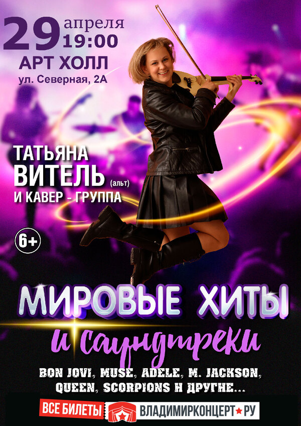 Концерты во Владимире Концерт «Мировые хиты и саундтреки»29 апреля 2025 в 19:00 У Вас есть исключительная возможность попасть на концерт «Мировые хиты и саундтреки», услышать любимые сердцу мелодии в уникальных авторских аранжировках, вновь прожить забытые чувства и перенестись в мир музыки и кинематографа! Искрометная энергетика молодых и горящих своим делом артистов не оставит вас равнодушными. Вы услышите мощные гитарные риффы, упругий бас, виртуозные клавишные, энергичные барабаны и непревзойденный солирующий альт – Татьяна Витель (выпускник Московской Государственной Консерватории им.П. И. Чайковского, победитель и лауреат международных конкурсов). Каждый наш концерт – это подарок неповторимых эмоций, который может удовлетворить самый взыскательный музыкальный вкус: от классики до рока, и конечно же, популярные мировые произведения! Билеты по ссылке: https://vk.cc/cL26Fd Дата: 29 апреля 2025 Начало: в 19.00 Место: Art Hall Адрес: г. Владимир, ул. Северная, 2А Информация с https://arthall.org/events/kontserty/tatyana-vitel-i-kaver-gruppa-mirovye-khity-i-saundtreki-2 « вернуться владимирская афиша другие концерты во Владимире |