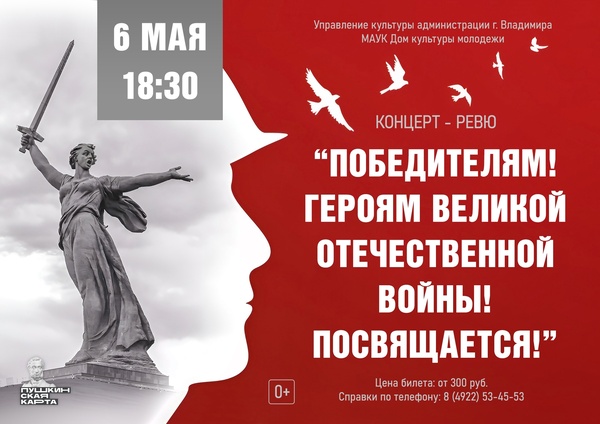 Концерты во Владимире Концерт-ревю «Победителям! Героям Великой Отечественной войны! Посвящается!»06 мая 2025 в 18:30 МАУК «Дом культуры молодёжи» приглашает на концерт-ревю «Победителям! Героям Великой Отечественной войны! Посвящается!»». Роковые и героические годы Великой Отечественной войны 1941–1945 годов. Время испытания и подвига! В преддверии празднования 80-летия Великой Победы Дом культуры молодежи совместно с творческими коллективами г. Владимира с огромной любовью и благодарностью всем совершившим этот невероятный подвиг подготовил большую концертную программу. Подвиг Великого народа отраженный в песнях, стихах, репортажах военных корреспондентов и воспоминаниях фронтовиков. В этот день на сцену выйдут: - образцовый коллектив детская хореографическая студия «Улыбка» - образцовый коллектив театр песни «Амега» - образцовый коллектив Детский театр балета им. Н.В. Мадьяровой - лауреаты всероссийских и международных конкурсов Артем Бердышев и Алексей Молдалиев - Муниципальный ансамбль «Вишенка», худ. рук. – заслуженный работник культуры Р.Ф. Е. Агапов - и многие другие. Песни Великой Победы! Стихи Великой Победы! Память о Великой Победе! Цена билета: 300, 400 рублей Действует Пушкинская карта Билеты уже в продаже: https://quicktickets.ru/vladimir-dk-molodyozhi/s468 Дата: 06 мая 2025 Начало: в 18.30 Место проведения: Дом культуры молодежи, концертный зал Адрес: г. Владимир, ул. Мира, д. 55 Информация с https://vk.com/dkmvladimir?z=photo-51317454_457258034%2F25081f55d0a530cb70 « вернуться владимирская афиша другие концерты во Владимире |
