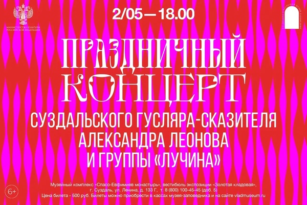 Концерты во Владимире Концерт суздальского гусляра-сказителя и группы «Лучина»02 мая 2025 в 18:00 2 мая в Спасо-Евфимиевом монастыре Суздаля в рамках проекта «Музыкальные истории» состоится уникальный концерт. Его участники - известный суздальский гусляр и звонарь Александр Леонов и Группа «Лучина». Сегодня мало кто знает, что из себя представляют гусли, рожки, жалейки и другие музыкальные инструменты - традиционные у древних славян. Так вот, музей предлагает познакомиться с искусством «гудения» и открыть в себе культурный код предков. Это будет невероятный опыт! Александр Леонов и Группа «Лучина» - суздальская команда, которая проводит реставрацию русских песен, играет на старинных музыкальных инструментах, популяризирует древнерусское искусство. А фронтмен Александр Леонов - не только прекрасный гусляр, но и талантливый звонарь, мастерством которого восхищаются гости Спасо-Евфимиева монастыря. На концерте вы услышите редкие песни - русские народные, исторические, духовные, патриотические, а также фрагменты былин и древних текстов в аранжировке группы «Лучина». Билеты по ссылке: https://vk.cc/cL7fcm Дата: 2 мая 2025 Начало: в 18.00 Адрес: г. Суздаль, ул. Ленина, 133-г Информация с https://vk.com/wall-45340836_24341 « вернуться владимирская афиша другие концерты во Владимире |