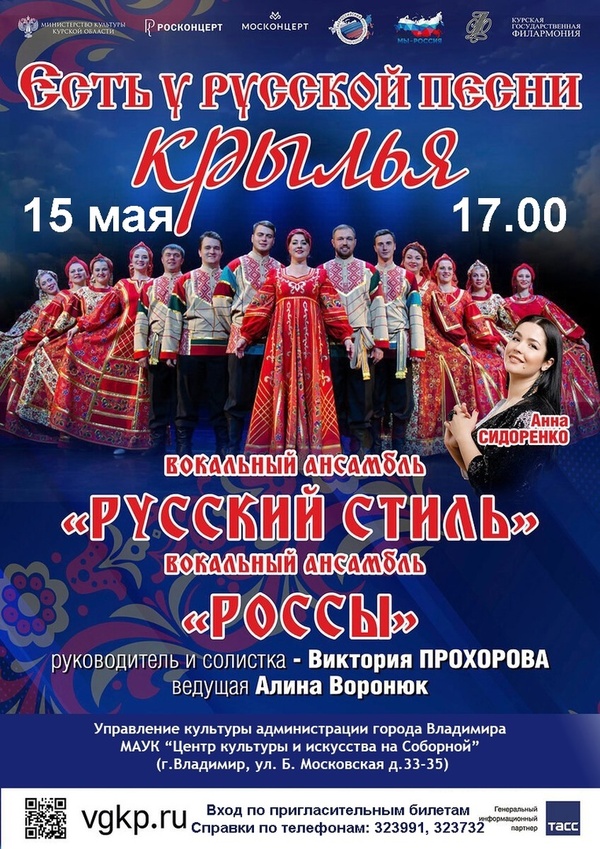 Концерты во Владимире Концерт "Есть у русской песни крылья"15 мая 2025 в 17:00 15 мая в 17:00 приглашаем в Центр культуры и искусства на Соборной на концерт "Есть у русской песни крылья". Для вас выступят вокальные ансамбли "Русский стиль" и "Россы", руководитель и солистка - Виктория Прохорова, ведущая концерта Алина Воронюк. Место проведения: Центр культуры и искусства на Соборной Адрес: г. Владимир, ул. Большая Московская, 33/35 Тел. для справок: 8 (4922) 32-39-91, 8 (4922) 32-37-32 Вход по пригласительным билетам. Информация с https://vk.com/wall-45749277_3000 « вернуться владимирская афиша другие концерты во Владимире |