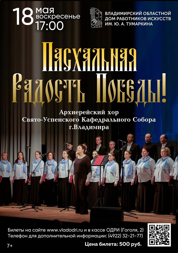 Концерты во Владимире Концерт «Пасхальная радость Победы»18 мая 2025 в 17:00 Духовно-патриотический концерт «Пасхальная радость Победы» состоится в ОДРИ 18 мая. В праздничном концерте примут участие Архиерейский хор Свято-Успенского Кафедрального собора г. Владимира (регент Татьяна Оганян) и Детский Епархиальный хор при Свято-Успенском Кафедральном соборе г. Владимира (Художественный руководитель Татьяна Оганян, дирижёр Татьяна Пичкова) Солисты: Протодьякон Сергий Мешков, протодьякон Павел Фоменко, дьякон Павел Швачка, Роман Климентовский, Юлия Горчакова Илария Мешкова, Иван Манапов, Александра Костановская, Мария Соловьёва Ведущий концерта: Протоиерей Виктор Тарасов В концерте прозвучат: Духовные произведения, песни о Родине, а также всем известные песни военных лет. Приглашаем всех желающих разделить с нами Пасхальную радость и почтить Память о Победе в Великой Отечественной Войне. Продолжительность: 1 час 30 минут без антракта Цена билета: 500 руб. Билеты по ссылке: https://vmuzey.com/event/koncert-pashalnaya-radost-pobedy Дата: 18 мая 2025 Начало: в 17.00 Место проведения: Владимирский областной Дом работников искусств Адрес: г. Владимир, ул. Гоголя, 2 Информация с https://vladodri.ru/events/koncert-pashalnaja-radost-pobedy/ « вернуться владимирская афиша другие концерты во Владимире |