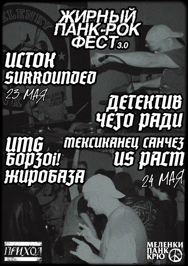 Концерты во Владимире ЖИРНЫЙ ПАНК-РОК ФЕСТ 3.023 мая 2025 в 23:59 ЖИРНЫЙ ПАНК-РОК ФЕСТ В ТРЕТИЙ РАЗ НА ВЛАДИМИРСКОЙ ЗЕМЛЕ 23 мая - разогрев ИСТОК SURROUNDED ДЕТЕКТИВ ЧЕГО РАДИ 24 мая - подогрев ЖИРОБАЗА U.M.G. БОРЗOi! МЕКСИКАНЕЦ САНЧЕЗ US PàLM Вход с 19:00 оба дня Билеты: https://qtickets.ru/event/167310 Место проведения: ДК ПРИХОД Адрес: г. Владимир, ул. Луначарского, д. 3и Информация с https://vk.com/fatpunkrockfest3 « вернуться владимирская афиша другие концерты во Владимире |