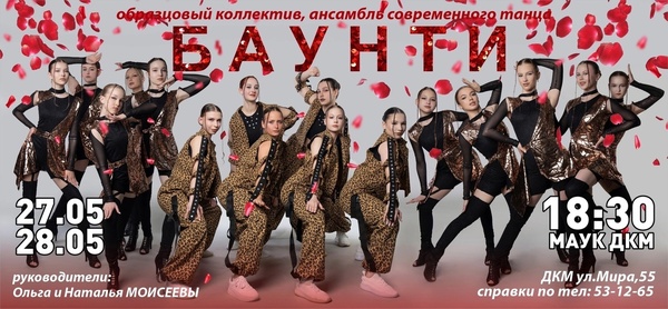 Концерты во Владимире Отчетный концерт ансамбля современного танца «Баунти»27 мая 2025 в 18:30 Образцовый коллектив Ансамбль современного эстрадного танца «Баунти» – это синтез яркого шоу и сложной современной хореографии. В концерте примут участие более 200 воспитанников от 5 до 20 лет, и все они неоднократные победители различных конкурсов и фестивалей Всероссийского и Межударного уровня в разных номинациях. В этом году ансамбль собрал в Отчетный концерт свои лучшие постановки и номера. Это и номера с использованием предмета, номера с элементами акробатики и художественной гимнастики, номера в различных направлениях современной хореографии. Каждый год, отчетный концерт «Баунти» – это переаншлаг, поэтому, если вы еще не видели, что такое «Баунти» очень советуем поторопиться с покупкой билетов. Цена билета: 450 рублей Действует Пушкинская карта Билеты уже в продаже: https://quicktickets.ru/vladimir-dk-molodyozhi/s474 Дата: 27 и 28 мая 2025 Начало: в 18.30 Место проведения: Дом культуры молодежи, Концертный зал Адрес: г. Владимир, ул. Мира, д. 55 Справки по тел.: 8 (4922) 53-12-65 Информация с https://vk.com/wall-51317454_9538 « вернуться владимирская афиша другие концерты во Владимире |