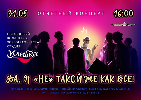 Концерты во Владимире Отчетный концерт Детской хореографической студии «Улыбка»31 мая 2025 в 16:00 31 мая в 16:00 Образцовый коллектив «Детская хореографическая студия «Улыбка» ярко завершит свой творческий сезон и представит зрителю отчетный концерт «Да, я «не» такой же как все» в который войдут уже полюбившиеся зрителю, танцы, а также рекордное количество новых постановок! В концерте примут участие ВСЕ, без исключения, участники коллектива: от самых маленьких, до самых больших! Подарят настоящий праздник танца и докажут, что они «не такие как все!». Цена билета: 300 рублей Действует Пушкинская карта Билеты уже в продаже: https://quicktickets.ru/vladimir-dk-molodyozhi/s476 Дата: 31 мая 2025 Начало: в 16.00 Место проведения: Дом культуры молодежи Адрес: г. Владимир, ул. Мира, д. 55 Справки по тел.: 8 (4922) 53-45-53 Информация с https://vk.com/wall-16951266_464 « вернуться владимирская афиша другие концерты во Владимире |