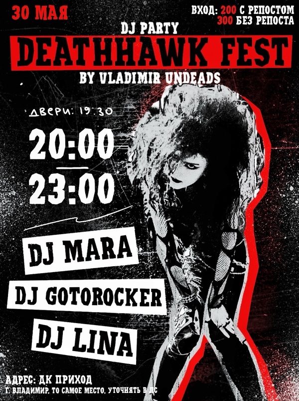 Концерты во Владимире DEATHHAWK FEST30 мая 2025 в 20:00 Опа опа, а вот и обещанный анонс. Ждите нас 30 мая в том самом месте! Df в честь дня готхов. Дата: 30 мая 2025 Двери: с 19.30 Время: с 20.00 до 23.00 Место проведения: ДК ПРИХОД Адрес: г. Владимир, ул. Луначарского, д. 3и Информация с https://vk.com/club228734773 « вернуться владимирская афиша другие концерты во Владимире |