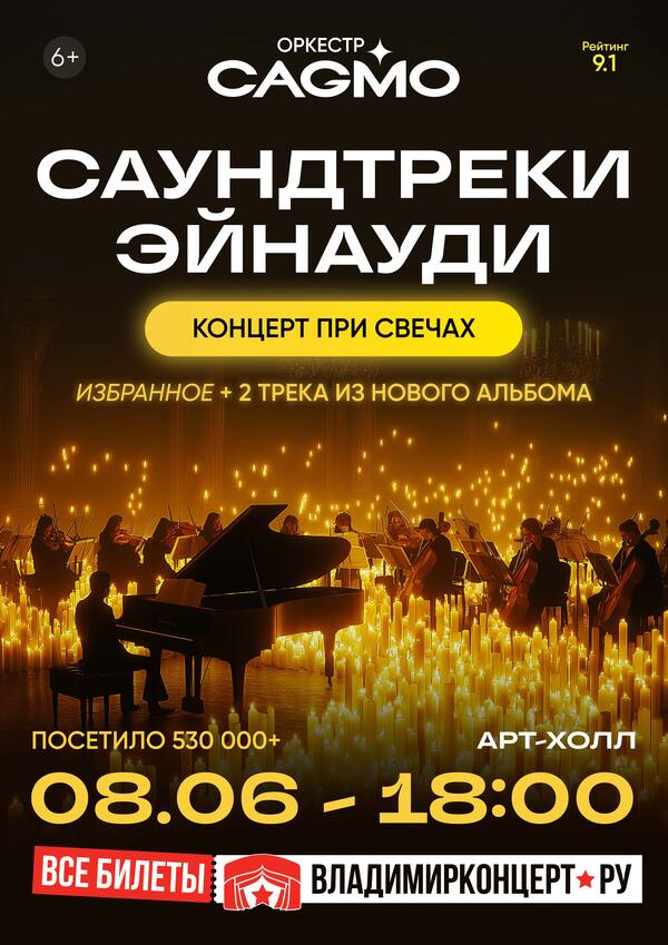 Концерты во Владимире Оркестр CAGMO. «Саундтреки Эйнауди при свечах»08 июня 2025 в 18:00 CAGMO представляет концертную программу по мотивам творчества великого композитора – «Саундтреки Эйнауди при свечах» в исполнении струнных и фортепиано. В программу добавлены треки из нового альбома "The Summer Portraits": Sequence, Pathos. Людовико Эйнауди – знаменитый итальянский композитор и пианист, один из самых выдающихся представителей современной классической музыки и автор саундтреков к таким популярным фильмам, как: «1+1», «Чёрный лебедь», «Это – Англия», «Земля кочевников» и многим другим. Проникновенная музыка композитора стала неотъемлемой частью сюжета знаменитого французского фильма «1+1» и навсегда влюбила зрителей в его творчество. Атмосферные саундтреки Эйнауди дополнили глубокий смысл кинокартины и сыграли важную роль в мировом признании французского фильма. CAGMO представляет концертную программу с самыми яркими саундтреками знаменитого итальянского композитора – «Саундтреки Эйнауди при свечах». Уникальные симфонические аранжировки композиций в исполнении струнных и фортепиано подарят чувство погружения в атмосферу любимых кинокартин. Новое звучание знаменитых мелодий тронет до глубины души каждого, кто знаком с «1+1» и многими другими популярными фильмами. Цена билета: 2500-5600 руб. Билеты по ссылке: https://vk.cc/cMttkf Дата: 08 июня 2025 Начало: в 18.00 Место: Art Hall Адрес: г. Владимир, ул. Северная, 2А Информация с https://arthall.org/events/kontserty/orkestr-cagmo-saundtreki-ejnaudi-pri-svechakh-5 « вернуться владимирская афиша другие концерты во Владимире |
