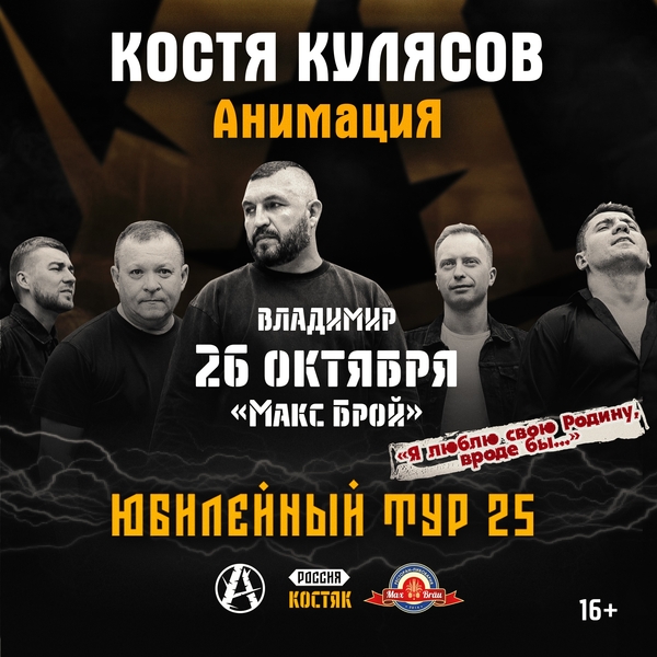 Концерты во Владимире Юбилейный тур «КОСТЯ КУЛЯСОВ, АНИМАЦИЯ 25»26 октября 2025 в 20:00 Драйвово, дерзко и в самом электрическом звучании – этой осенью Костя Кулясов | АнимациЯ представит программу «Хиты проверенные временем и новые песни с будущего альбома" в рамках юбилейного тура "АнимациЯ 25 лет ". Будьте в числе первых, кто узнает о новых хитах! БИЛЕТЫ: https://clck.ru/3N7BVH «Я люблю свою Родину, вроде бы» - фраза из песни группы «АнимациЯ». Костя Кулясов, лидер группы, и тот самый автор, у которого что ни песня, то крылатое выражение. Ты услышишь полтора десятка ломовейших хитов и самые новые песни из альбома, который готовится к выходу. Будь первым, будь в курсе! Дата: 26 октября 2025 Начало: в 20.00 Место: ресторан-пивоварня «Макс Брой» Адрес: г. Владимир, ул. Дзержинского, 11, 2 этаж Информация с https://vk.com/club228066635 « вернуться владимирская афиша другие концерты во Владимире |