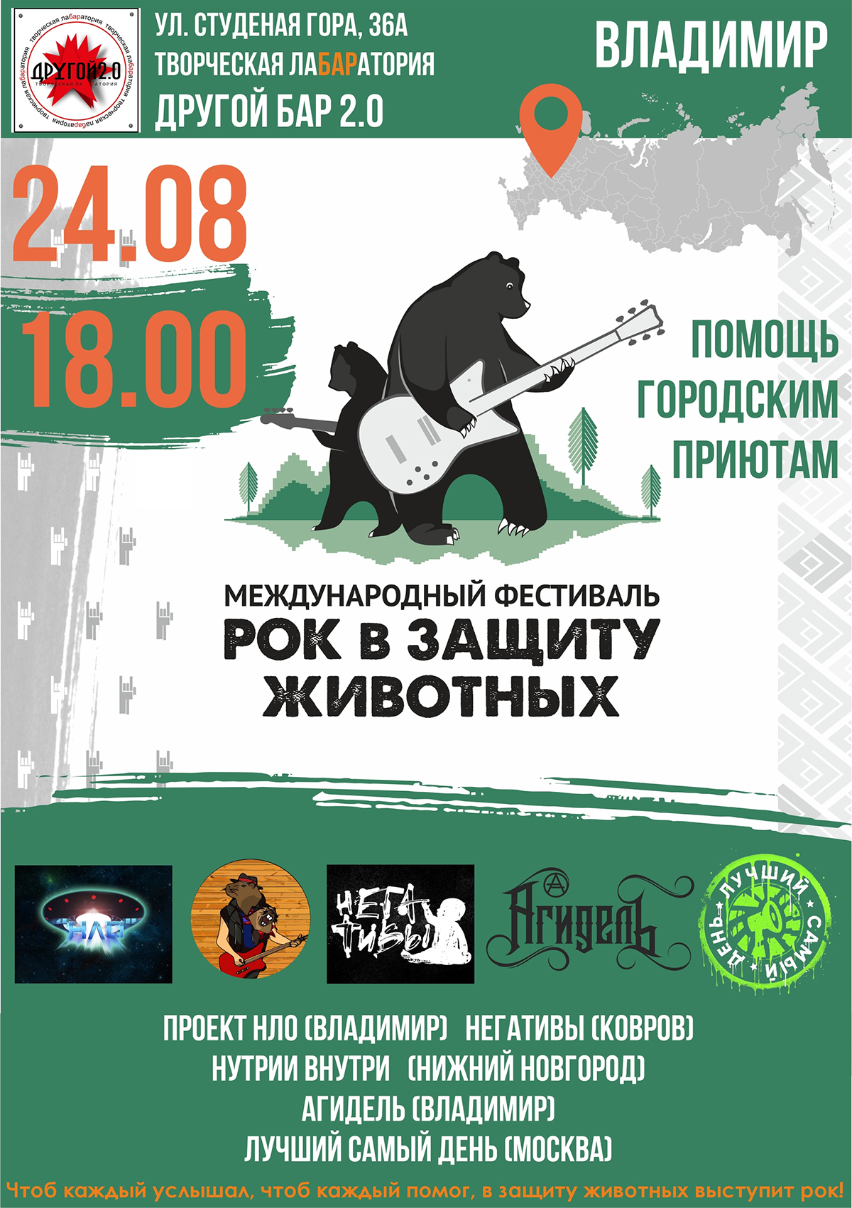 Концерты во Владимире Фестиваль "Рок в защиту животных"24 августа 2025 в 18:00 24 августа в баре Другой 2.0 продет фестиваль "Рок в защиту животных". Представляем поистине звездный состав групп-участниц фестиваля! Музыкальный проект "НЛО", г. Владимир Негативы, г. Ковров НУТРИИ ВНУТРИ, г. Нижний Новгород АГИДЕЛЬ, г. Владимир Лучший Самый День, г. Москва Начало: в 18.00 Место проведения: Другой Бар 2.0 Адрес: Владимир, Студёная гора 36 А Информация с https://vk.com/wall-168662122_1927 « вернуться владимирская афиша другие концерты во Владимире |