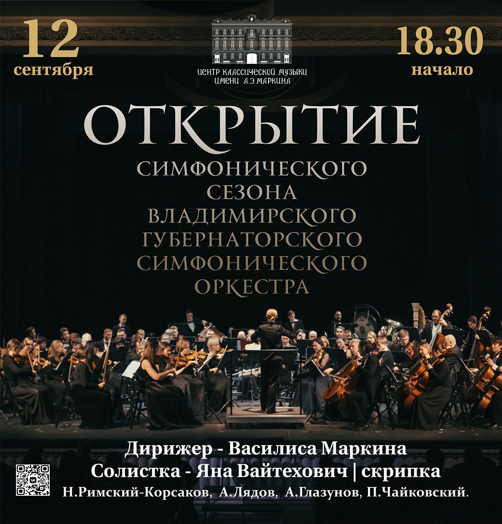 Концерты во Владимире Открытие XXVIII симфонического сезона ВГСО12 сентября 2025 в 18:30 По традиции первым коллективом Центра, открывающим свой зальный концертный сезон, вновь станет Владимирский Губернаторский симфонический оркестр. За плечами коллектива 27 сезонов и более 1000 сыгранных программ. Свой 2025-2026 концертный год оркестр начнет под управлением Василисы Маркиной Солистка программы – лауреат I степени VIII Областного открытого конкурса «Солист оркестра» - Яна Вайтехович (скрипка) Яна Вайтехович – учащаяся Центральной музыкальной школы-академии исполнительского искусства в классе преподавателя Гуляницкого А.А., лауреат множества международных конкурсов. Выступала на торжественном закрытии XVIII Международного Фестиваля В.Т. Спивакова «Москва встречает друзей», Детской Музыкальной Академии стран СНГ и Балтии Юрия Башмета, принимала участие в творческой летней школе «Новые имена» В программе концерта: Н. Римский-Корсаков. «Шабаш духов тьмы», «Адское коло»; «Утро» («Ночь на горе Триглав») А. Лядов Симфоническая картина «Волшебное озеро» А. Лядов. Симфоническая картина «Баба-Яга» П. Чайковский. Концерт для скрипки с оркестром Дата: 12 сентября 2025 года Начало: в 18:30 Место: Центр классической музыки Билеты в кассе Центра классической музыки по адресу: ул. Большая Московская, 28 Ежедневно с 10:00 до 19:00 (14:00-15:00 перерыв на обед) ПРОГРАММА ДОСТУПНА К ПОСЕЩЕНИЮ ПО ПУШКИНСКОЙ КАРТЕ Цена билета: 750 руб. Билеты по ссылке: https://vk.cc/cOCZN2 Телефоны для справок: 8 (4922) 32-27-71; 32-63-65 Информация с https://www.vgso.ru/?menu=concert&number=1060 « вернуться владимирская афиша другие концерты во Владимире |