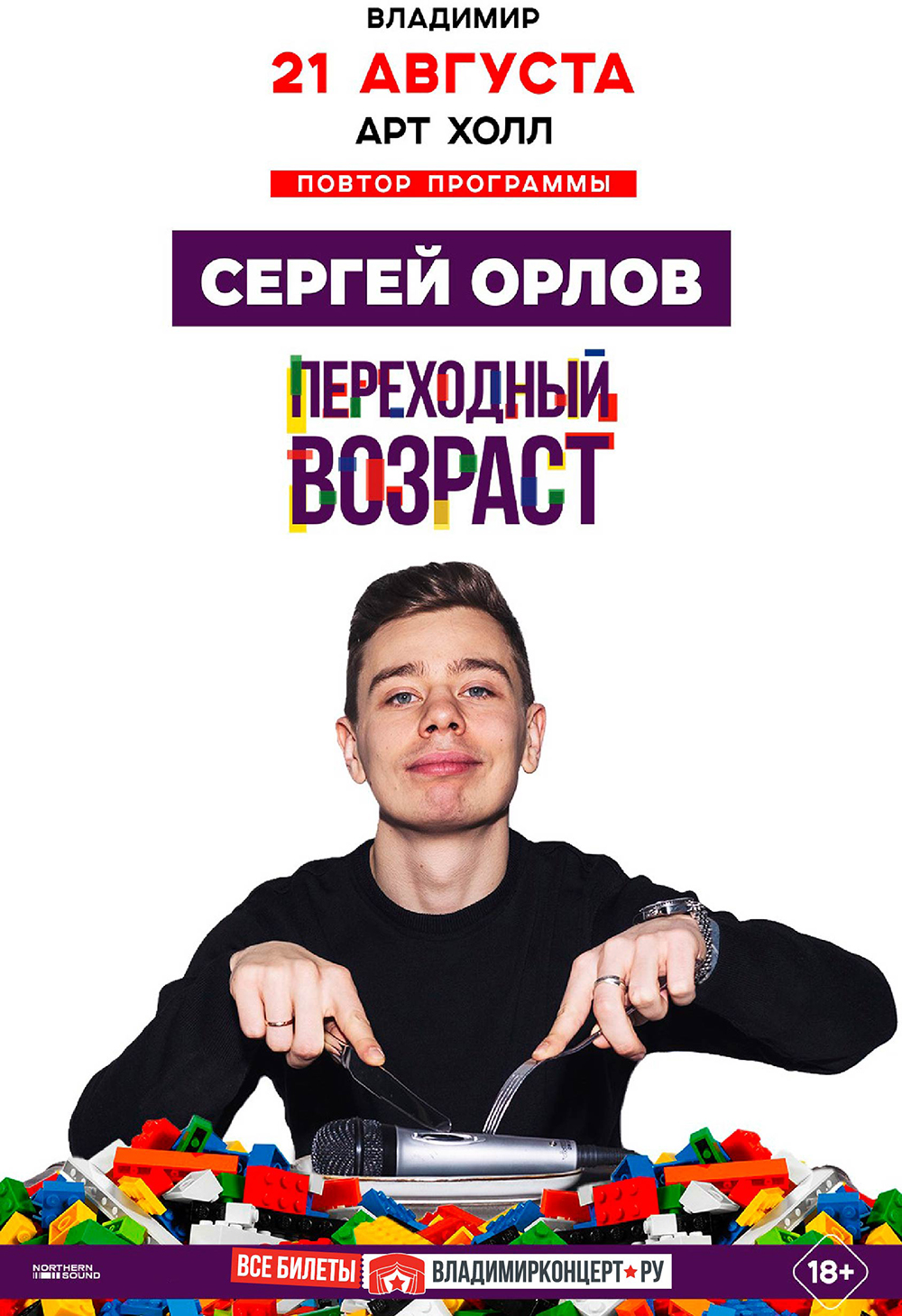 Концерты во Владимире STAND UP. Сергей Орлов с программой «Переходный возраст» (18+)21 августа 2025 в 19:00 Строго 18+. Организаторы могут потребовать оригинал паспорта на входе и отказать в посещении без компенсации стоимости билета, если возраст посетителя меньше 18 лет (N 93-ФЗ от 01.05.2019). Тур стендап-комика Сергея Орлова. Программа «Переходный возраст» (2024). Сергей Орлов родился в маленьком поселке Депутатский в республике Саха (Якутия). Его малая родина по сей день часто служит источником вдохновения для артиста. Сергей начал карьеру комика с выступлений на открытых микрофонах в Якутске, где впоследствии организовал «Северный Stand-Up Клуб». В 2018 году молодой артист переехал в Москву, где стремительно завоевал зрительскую любовь. Его истории привлекают слушателей своей жизненностью. Орлов шутит о понятных и близких каждому вещах, и любой может узнать себя в ситуациях, вокруг которых строятся стендап-выступления артиста. Во время концерта запрещается выходить на сцену, ходить по залу, стоять между рядами, шуметь, разговаривать между собой, разговаривать по телефону и иным образом мешать выступлению артиста. Категорически запрещается проносить в зрительный зал, а также употреблять в зрительном зале пищу и напитки, за исключением бутилированной негазированной воды. Также запрещается производить фото- и видеосъемку, аудиозапись выступления. Цена билета: 2700-7200 руб. Билеты по ссылке: https://vladimirkoncert.ru/shows/event/9361-Sergei-Orlov-Perekhodnyi-vozrast Дата: 21августа 2025 Начало: в 19.00 Место: Art Hall Адрес: г. Владимир, ул. Северная, 2А Информация с https://arthall.org/events/kontserty/sergej-orlov-perekhodnyj-vozrast-2 « вернуться владимирская афиша другие концерты во Владимире |