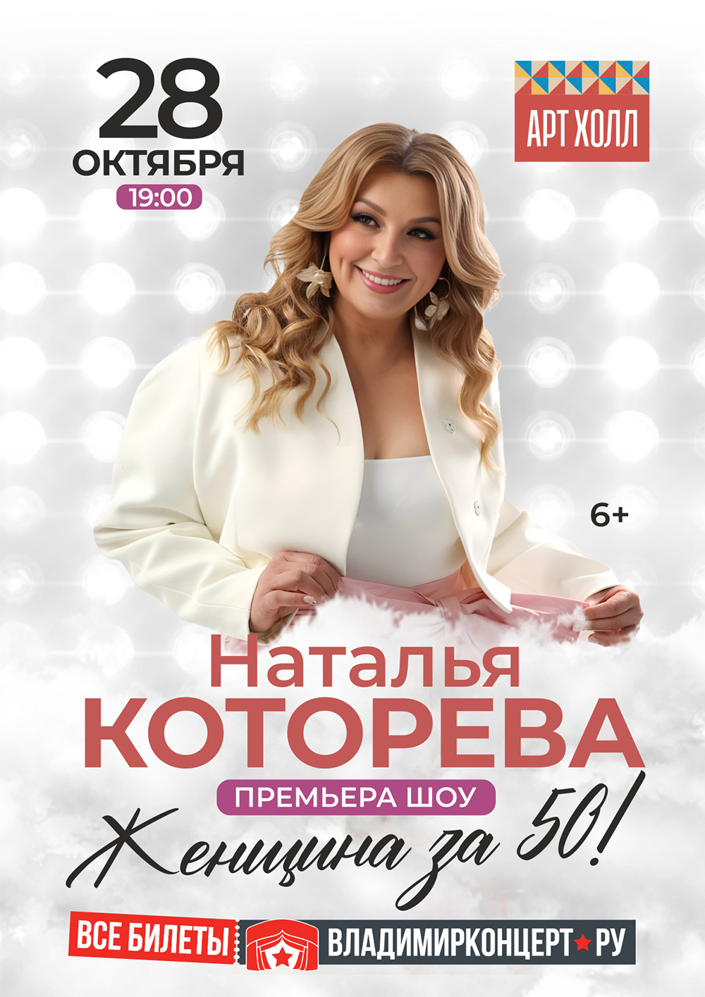 Концерты во Владимире Наталья Которева28 октября 2025 в 19:00 Уникальное шоу Натальи Которевой «Женщина за 50» — это яркий, эмоциональный концерт, где главную роль играет женщина. Та, которая выросла и состоялась, обрела профессию и семью и решила начать творческую жизнь. Женщина, которая поет! В программе шоу вы увидите зажигательные танцы и вокальные номера, много креативных находок и смелых решений. Завораживающие хореографические постановки и музыкальные композиции, написанные лучшими современными авторами станут основой шоу, раскрывая тему женской красоты, мудрости и энергии в любом возрасте. А спецэффекты, элементы акробатики и выступления цирковых артистов добавят зрелищности, создавая атмосферу настоящего праздника. Этот концерт — не просто выступление, а вдохновляющее представление, которое зарядит зрителей всех возрастов эмоциями и полным восхищением артисткой! Не пропустите шоу Натальи Которевой «Женщина за 50» — оно останется в вашей памяти надолго! Цена билета: 700-2000 руб. Билеты по ссылке: https://vladimirkoncert.ru/shows/event/9426-Natalya-Kotoreva Дата: 28 октября 2025 Начало: в 19.00 Место: Art Hall Адрес: г. Владимир, ул. Северная, 2А Информация с https://arthall.org/events/kontserty/natalya-kotoreva « вернуться владимирская афиша другие концерты во Владимире |