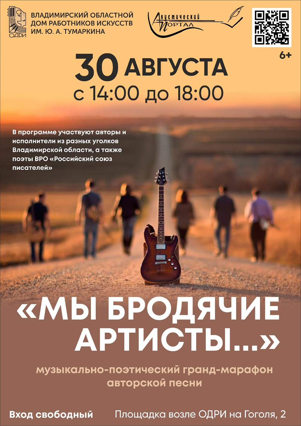 Концерты во Владимире Концерт "Мы бродячие артисты..."30 августа 2025 в 14:00 30 августа на площадке возле ОДРИ (на Гоголя, 2) с 14:00 до 18:00 пройдет музыкально-поэтический гранд-марафон авторской песни «МЫ БРОДЯЧИЕ АРТИСТЫ…». Каким будет День города Владимира на летней площадке ОДРИ? Музыкальным и поэтическим! Мы продолжаем добрую традицию проведения гранд-марафона авторской песни "Мы бродячие артисты..." Вместе с проектом Акустический портал собираем авторов и исполнителей со всей Владимирской области. К ним присоединятся владимирские поэты - члены ВРО Российский союз писателей. Душевное, искреннее и живое исполнение - на летней площадке ОДРИ, 30 августа с 14.00 до 18.00. Вход свободный! Информация с https://vk.com/id43485424 « вернуться владимирская афиша другие концерты во Владимире |