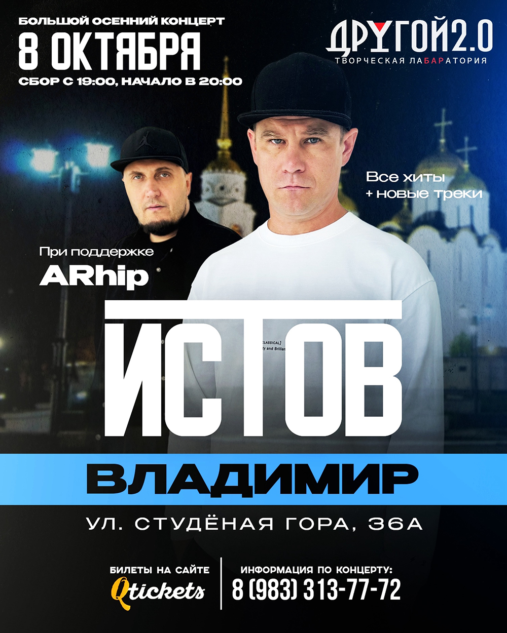 Концерты во Владимире ИСТОВ при участии ARhip08 октября 2025 в 20:00 ИСТОВ - это самобытный автор-исполнитель, с необычной харизмой, подачей и текстами, его песни это то, что мы видим вокруг себя, то, что переживаем и таим в себе, о чем кричим и радуясь молчим, песни Никиты это и есть наша жизнь. Хиты: Аэропорты, Белой птицей, Живой, Не лети так жизнь! Большая программа! Все хиты + новые песни! Крутая, душевная атмосфера. Билеты по ссылке: https://vk.cc/cP8Xdj Дата: 08 октября 2025 Начало: в 20.00 Место проведения: Другой Бар 2.0 Адрес: Владимир, Студёная гора 36 А Информация с https://vk.com/istov_official « вернуться владимирская афиша другие концерты во Владимире |