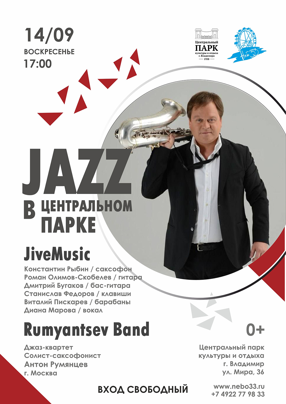 Концерты во Владимире JAZZ в Центральном парке14 сентября 2025 в 17:00 14 сентября проводим вечер в отличной компании талантливых артистов и друзей! ПРОГРАММА 17:00 Jive Music Константин Рыбин (саксофон) Роман Олимов-Скобелев (гитара) Дмитрий Бугаков (бас-гитара) Станислав Фёдоров (клавиши) Виталий Пискарев (барабаны) Диана Марова (вокал) 18:00 джаз-квартет Rumyantsev Band, город Москва солист-саксофонист Антон Румянцев Событие, которое нельзя пропустить! 14 сентября воскресенье 17:00 Центральный парк культуры и отдыха Вход свободный Информация с https://vk.com/wall-107410477_4672 « вернуться владимирская афиша другие концерты во Владимире |
