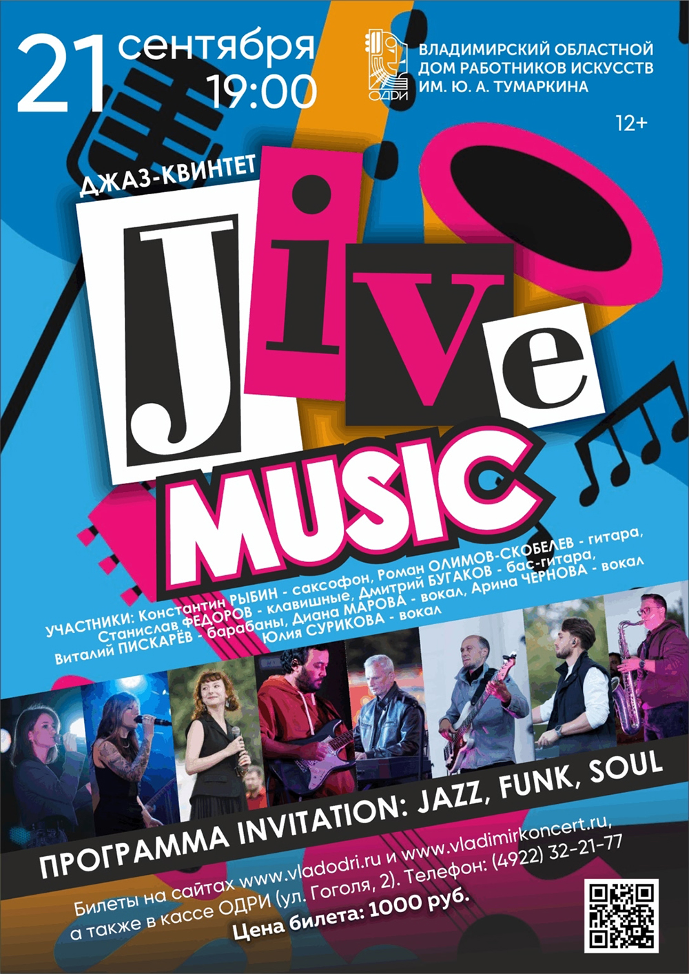 Концерты во Владимире Концерт джаз-квинтета «Jive music»21 сентября 2025 в 21:00 21 сентября в 19:00 на сцене ОДРИ — долгожданный концерт “Jive music”. На сцену выйдут мастера своего дела: владимирские и московские музыканты, чья игра — это всегда огонь, страсть и виртуозность. Их имена давно знакомы и любимы владимирской публикой, а их творческий союз — это всегда событие, гарантия высочайшего качества и незабываемых эмоций. Погрузитесь в магию живого звука. Проведите сентябрьский вечер в компании изысканной музыки и великолепных музыкантов. Константин Рыбин — саксофон Роман Олимов-Скобелев — гитара Станислав Федоров — клавишные Дмитрий Бугаков — бас-гитара Виталий Пискарёв — барабаны Диана Марова — вокал Арина Чернова — вокал Юлия Сурикова — вокал Это не просто концерт, это наша общая джазовая традиция. Цена билета: 1000 руб. Билеты по ссылке: https://vmuzey.com/event/koncert-dzhaz-kvinteta-jive-music Дата: 21 сентября 2025 Начало: в 19.00Место проведения: Владимирский областной Дом работников искусств Адрес: г. Владимир, улица Гоголя, 2 Информация с https://vladodri.ru/proshedshie-meroprijatija/koncert-dzhaz-kvinteta-jive-music/ « вернуться владимирская афиша другие концерты во Владимире |