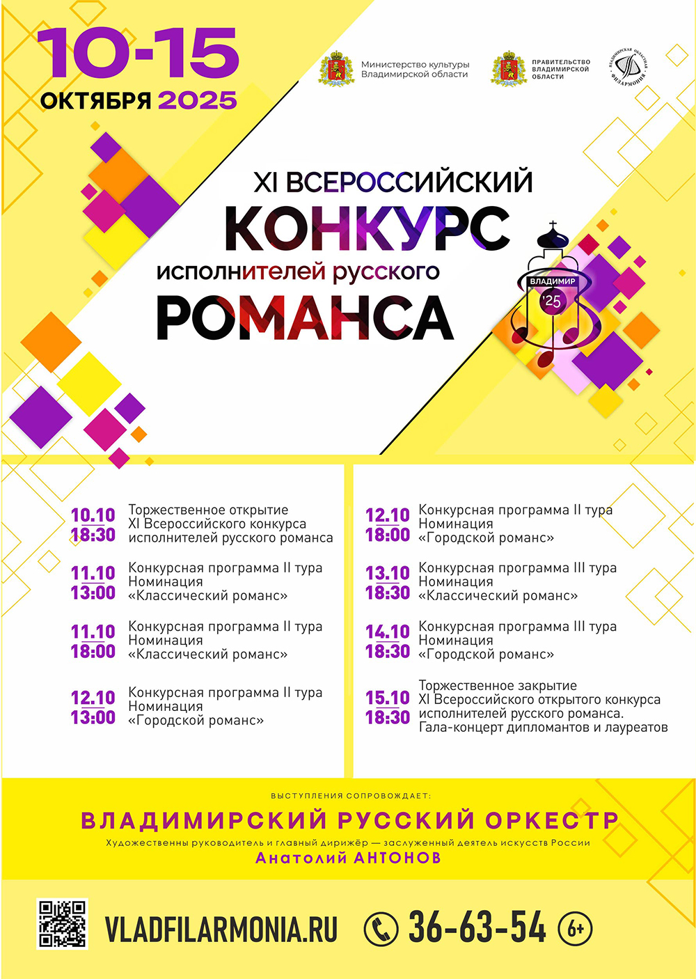 Концерты во Владимире Конкурсная программа II тура. Номинация «Классический романс»11 октября 2025 в 13:00 Абонемент №16 «XI Всероссийский конкурс исполнителей русского романса» В программе мероприятия выступления участников конкурса исполнителей романса. Продолжительность: 3 часа Цена билета: 300 руб. Билеты на концерт можно приобрести в кассе филармонии и онлайн по ссылке: https://iframeab-pre10088.intickets.ru/seance/65702810 Начало: в 13.00 Стоимость абонемента на 8 концертов: 2 000 руб. https://iframeab-pre10088.intickets.ru/event/65703941Купить абонемент онлайн: Место проведения: Владимирская областная филармония Адрес: г. Владимир, проспект Ленина, дом 1 Информация с http://www.vladfilarmonia.ru/afisha/concerts-in-vladimir/konkursnaya-programma-ii-tura-/ « вернуться владимирская афиша другие концерты во Владимире |