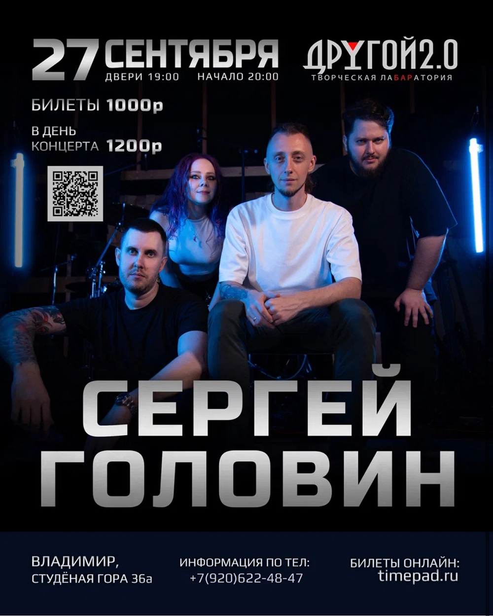 Концерты во Владимире Сергей Головин Band27 сентября 2025 в 20:00 27 сентября — Сергей Головин Band в Другом Баре 2.0 Гитарист-виртуоз впервые во Владимире с полноценным концертом! В программе: яркие мелодии, стремительные риффы, виртуозные соло и атмосферу музыки 80-х. Всё это — на одном дыхании, вживую и по-настоящему. Сергей Головин — гитарист, композитор и преподаватель, один из лучших российских музыкантов, посвятивших себя прогрессив-року и металлу. В его музыке сочетаются яркие мелодии, быстрые риффы, виртуозные соло и атмосфера музыки 80-х, когда закладывались каноны жанра. Сергей записал четыре альбома в качестве лидера, выполнил несколько крупных туров по стране, выступал на фестивалях в Московском Доме Музыки. Он преподаёт на международном гитарном портале JTC наряду с Гатри Гованом, Алексом Хатчингсом и Энди Джеймсом — крупнейшими гуру современной гитарной музыки. На сцене: Сергей Головин — гитара Денис Антропов — ударные Ольга Петрунина — клавиши Кирилл Гревцов — бас Вход: 1000 руб. — предварительно, 1200 руб. — в день концерта БИЛЕТЫ по ссылке: https://sergey-golovin.timepad.ru/event/3534974/ Инфо: +7 920 622-48-47 Двери: с 19.00 Старт: в 20.00 Место проведения: Другой Бар 2.0 Адрес: Владимир, Студёная гора 36 А Информация с https://vk.com/wall-136740493_5637 « вернуться владимирская афиша другие концерты во Владимире |