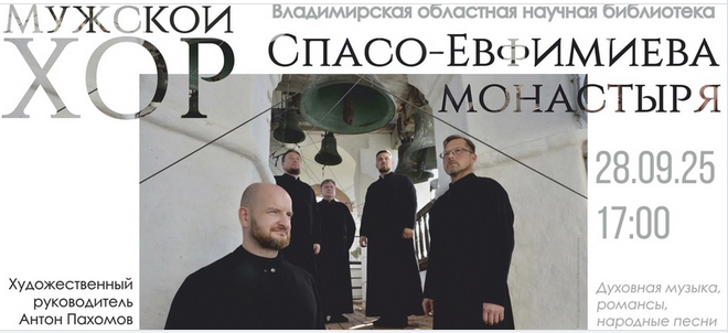 Концерты во Владимире Концерт мужского хора Спасо-Евфимиева монастыря28 сентября 2025 в 17:00 Великолепное пение, заставляющее замирать сердце! 28 сентября мужской хор Спасо-Евфимиева монастыря выступит в стенах Владимирской областной научной библиотеки. Вас ждёт насыщенная программа из двух отделений, где духовная глубина сочетается с лирической нежностью и мощной народной энергетикой. Концерт станет путешествием сквозь эпохи и гамму чувств: Духовная музыка, возносящая дух: от «Всепетой молитвы Богородице» до гениальной «Жертвы вечерней» Чеснокова. Лирические романсы, трогающие до слёз: «Отговорила роща золотая» на стихи Есенина и прекрасный «Ноктюрн» Бабаджаняна. Яркие народные и авторские песни, такие как «Ходят кони» Дашкевича и Кима. Под руководством художественного руководителя Антона Пахомова четыре уникальных голоса — Олег Привалов, Александр Песцов, Александр Шелманов и Сергей Понюхов — сливаются в удивительную, завораживающую гармонию. Каждый певчий обладает своим неповторимым тембром, и вместе они создают звучание, которое гости не просто слушают, а чувствуют всем сердцем. Вход на концерт — свободный! Не упустите возможность подарить себе незабываемый вечер! Дата: 28 сентября 2025 Начало: в 17.00 Место проведения: Владимирская областная научная библиотека Адрес: г. Владимир, ул. Дзержинского, 3 Информация с https://vk.com/wall183973595_957 Приходите всей семьёй, приглашайте друзей! Это событие, которое останется в памяти надолго. « вернуться владимирская афиша другие концерты во Владимире |