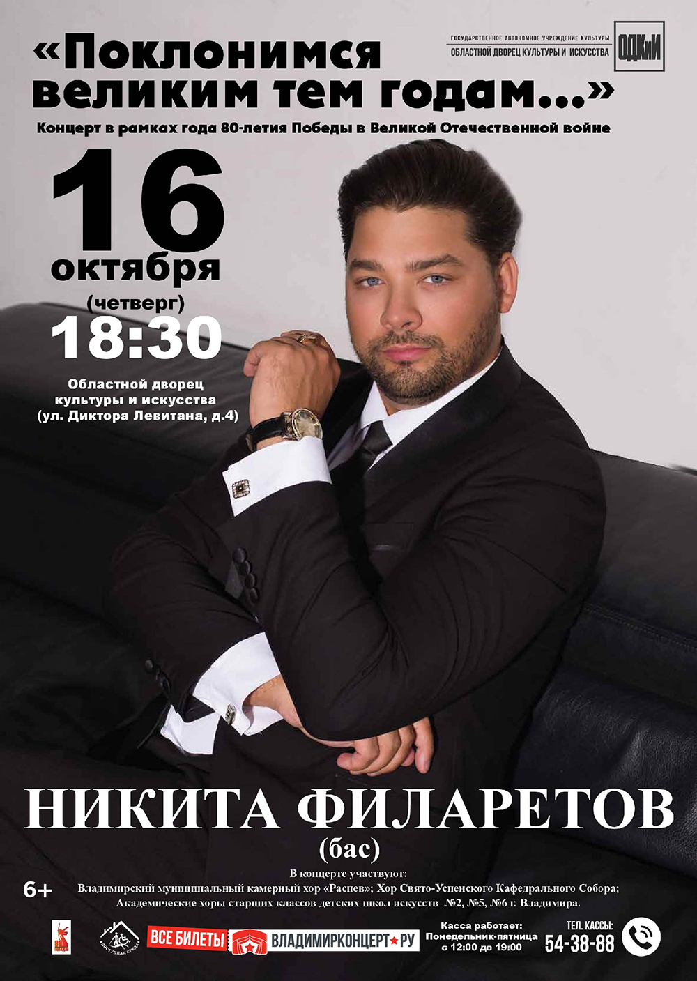 Концерты во Владимире Никита Филаретов «Поклонимся великим тем годам»16 октября 2025 в 18:30 Сольный концерт Никиты Филаретова «Поклонимся великим тем годам» состоится в рамках 80-ой годовщины Победы в Великой Отечественной войне, а также в рамках Года Героев Отечества. Никита Филаретов уроженец города Владимир, учился во Владимирском областном музыкальном колледже им. А.П. Бородина, окончил Российскую академию музыки им. Гнесиных. В концерте прозвучат всеми известные военно-патриотические песни такие как: Катюша, Смуглянка, Поклонимся великим тем годам, День Победы, Журавли, Эх, дороги и другие... В концерте участвуют: — Муниципальный камерный хор «Распев» (Художественный руководитель и дирижер Заслуженный деятель искусств РФ, профессор Наталья Колесникова); — Хор Свято-Успенского собора Владимирской Епархии (Регент Оганян Т.В.); — Образцовый коллектив концертный хор старших классов ДШИ №2 им. С.С. Прокофьева (Руководитель Криницына Н.А.); — Хоровой ансамбль мальчиков ДШИ №2 им. С.С. Прокофьева (Руководитель Криницына Н.А.) — Академический хор старших классов ДШИ №5 (Руководитель Сайгак Э.В.); — Академический хор старших классов ДШИ №6 им. В.А. Солоухина (Руководитель Леонтьева Н.А.). Цена билета: 600 руб. Действует Пушкинская карта Билеты по ссылке: https://vk.cc/cQ5QqV Дата: 16 октября 2025 Начало: в 18.30 Место проведения: Областной Дворец культуры и искусства Адрес: г. Владимир, ул. Диктора Левитана, д. 4 Информация с http://odk33.ru/afisha/ « вернуться владимирская афиша другие концерты во Владимире |