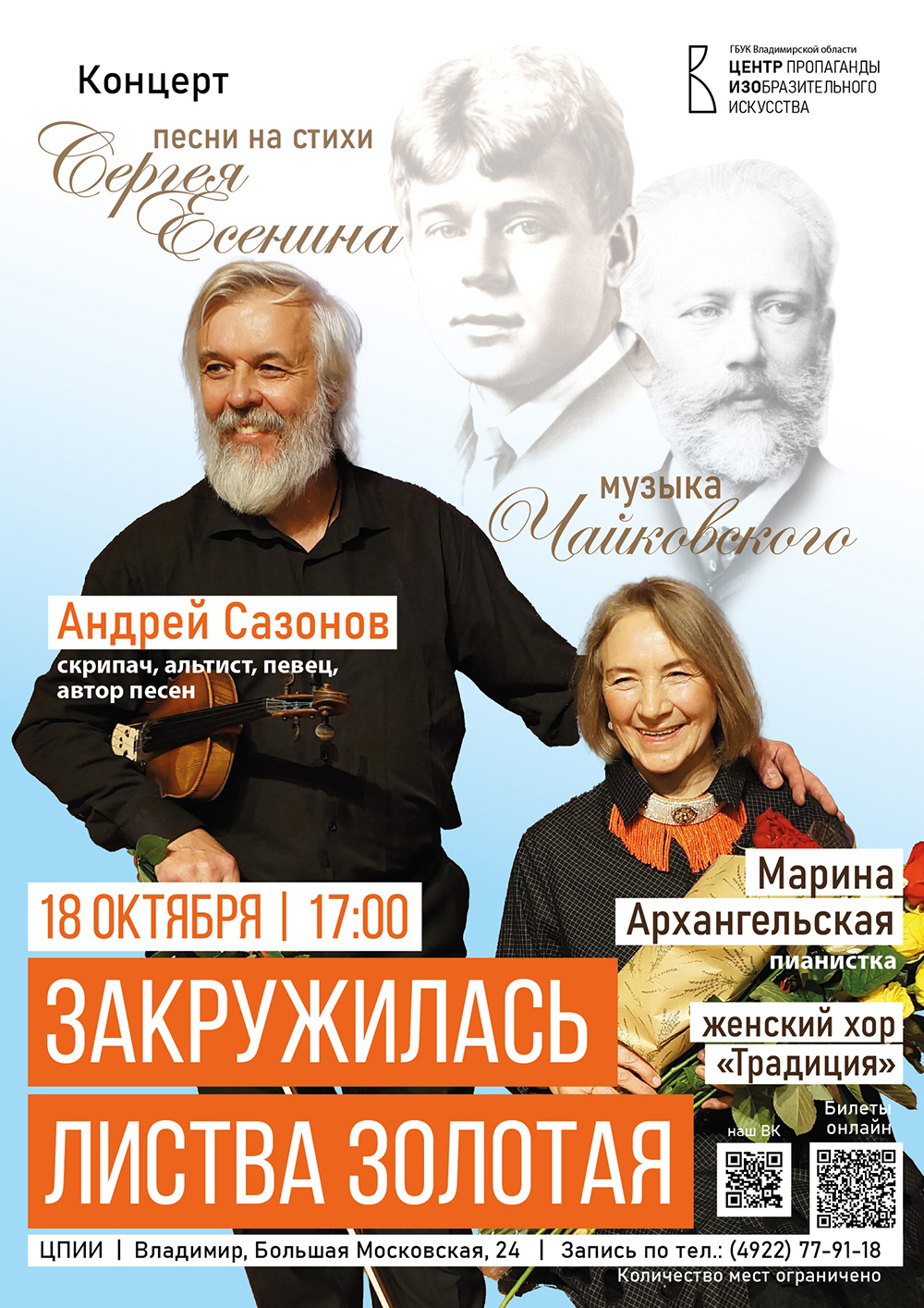 Концерты во Владимире Концерт Андрея Сазонова "Закружилась листва золотая..."18 октября 2025 в 17:00 Музыка на выставке! Друзья! Приглашаем 18 октября на концерт Андрея Сазонова "Закружилась листва золотая..."! Мы очень любим эти концерты. Андрей и Марина Архангельская уже выступали у нас на двух открытиях выставок и это был настоящий праздник! Мы решили организовать полноценный концерт Андрея Сазонова - это редкая возможность прикоснуться душой к прекрасному и вечному. С радостью делимся этой возможностью с вами! Андрей Сазонов - скрипач, альтист, певец, автор песен. Много лет работал в Ансамбле солистов Московской Филармонии "КОНЦЕРТИНО" под управлением Заслуженного артиста России А. Корсакова. Выступал в лучших залах России - Большом зале Московской консерватории, Ленинградской филармонии, гастролировал в городах СССР и за рубежом( Франция, Германия, США, Греция, Польша, Испания, Италия и др.). Много выступает- как солист и ансамблист. А. Сазонов записал диск "Мелодия любви" с песнями Муслима Магомаева. Неизменной спутницей на концертах является пианистка Марина Архангельская. 💥В концерте примет участие женский хор ТРАДИЦИЯ. В концерте прозвучат песни Андрея Сазонова на стихи Сергея Есенина, над которыми он работал много лет, а также музыка П.И. Чайковского - из балетов, романсы, вариации на тему рококо. Начало концерта – в 17:00. Стоимость билетов – 500 рублей. Приобрести их можно заранее в кассе Центра ИЗО или онлайн перейдя по ссылке: https://vladimirculture.ru/events/78703/koncert-zakruzhilas-listva-zolotayaМероприятие рассчитано на гостей старше 6 лет. Место проведения: Центр пропаганды изобразительного искусства Адрес: г. Владимир, ул. Большая Московская, д. 24 Информация с https://vk.com/wall-87253274_9723 « вернуться владимирская афиша другие концерты во Владимире |