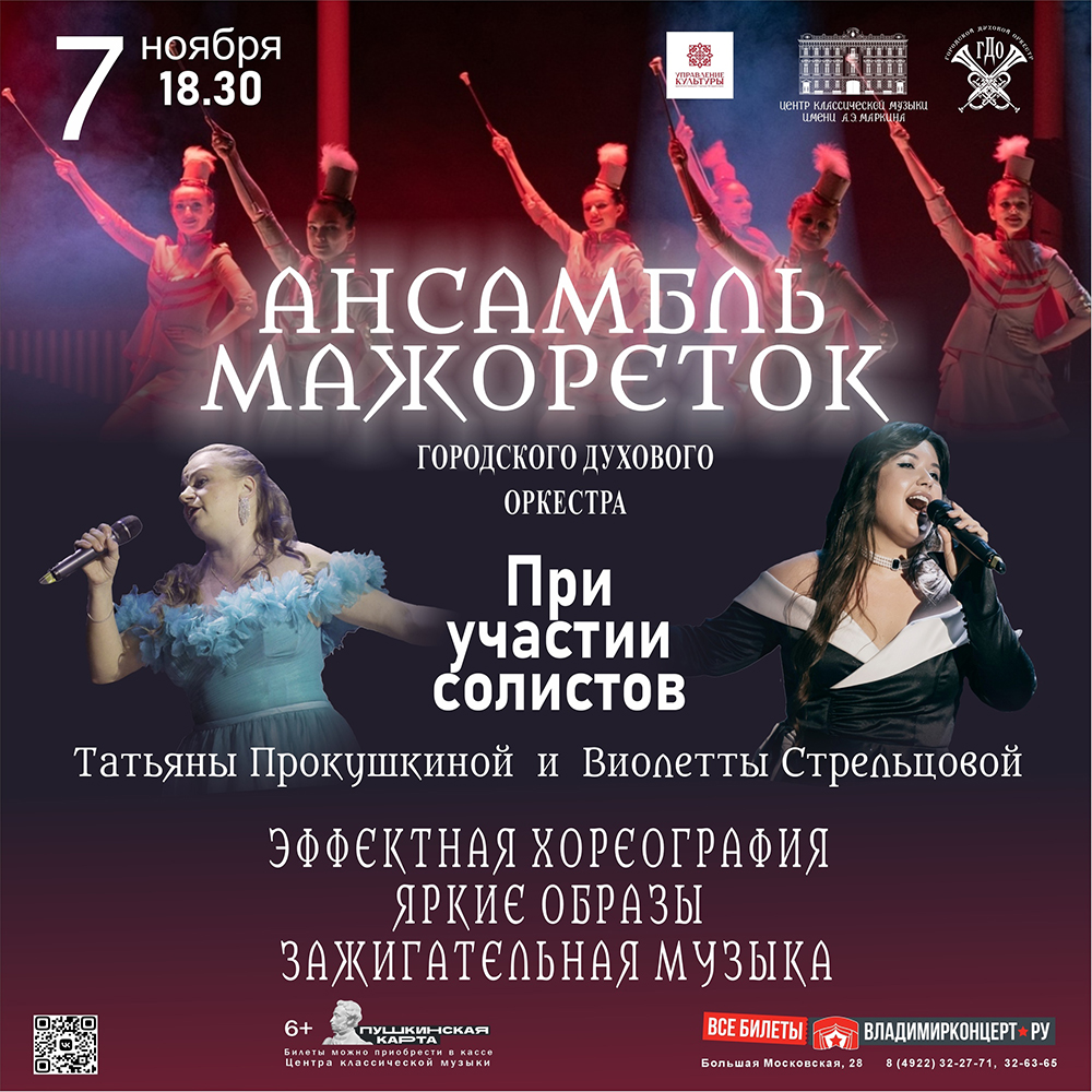 Концерты во Владимире Отчётный концерт Ансамбля мажореток07 ноября 2025 в 18:30 И вновь на сцене наш блистательный Ансамбль мажореток Городского духового оркестра. Концерты Ансамбля оставляют после себя ощущение восторга и эмоционального подъёма, хочется слушать зажигательную музыку и радоваться каждому новому дню. А всё потому, что на концертах коллектива происходит настоящее шоу со множеством костюмов, огромным количеством слаженных движений и с участием солисток Татьяны Прокушкиной и Виолетты Стрельцовой. Не редки и приглашенные гости-инструменталисты, в исполнении которых можно услышать современные известные композиции и авторскую импровизацию. В общем, отличное настроение и эмоциональный подъем гарантируем. Приходите прикоснуться к мастерству твирлинга и насладиться настоящим шоу мажореток. Дата: 07 ноября 2025 года Начало: в 18:30Место: Центр классической музыки Билеты в кассе Центра классической музыки по адресу: ул. Большая Московская, 28 Ежедневно с 10:00 до 19:00 (14:00-15:00 перерыв на обед) ПРОГРАММА ДОСТУПНА К ПОСЕЩЕНИЮ ПО ПУШКИНСКОЙ КАРТЕ Билеты по ссылке: https://vk.cc/cQFPdG Телефоны для справок: 8 (4922) 32-27-71; 32-63-65 Информация с https://www.vgso.ru/?menu=concert&number=1076 « вернуться владимирская афиша другие концерты во Владимире |