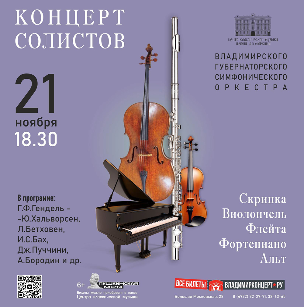 Концерты во Владимире Концерт камерной музыки солистов ВГСО21 ноября 2025 в 18:30 Владимирский губернаторский симфонический оркестр богат профессиональными музыкантами во всех группах, но зритель привык видеть их в составе коллектива и следить за их слаженными движениями под руководством дирижеров. Теперь у вас есть возможность познакомиться с исполнителями поближе. В этот вечер солисты оркестра исполнят произведения на скрипке, флейте, альте и фортепиано. В программе – произведения для ансамблей и солистов композиторов Людвига ван Бетховена, Иоганна Себастьяна Баха, Макса Христиана Фридриха Бруха, Милия Балакирева и др. Дата: 21 ноября 2025 года Начало: в 18:30 Место: Центр классической музыки Билеты в кассе Центра классической музыки по адресу: ул. Большая Московская, 28 Ежедневно с 10:00 до 19:00 (14:00-15:00 перерыв на обед) ПРОГРАММА ДОСТУПНА К ПОСЕЩЕНИЮ ПО ПУШКИНСКОЙ КАРТЕ Билеты по ссылке: https://vk.cc/cQFSDN Телефоны для справок: 8 (4922) 32-27-71; 32-63-65 Информация с https://www.vgso.ru/?menu=concert&number=1074 « вернуться владимирская афиша другие концерты во Владимире |