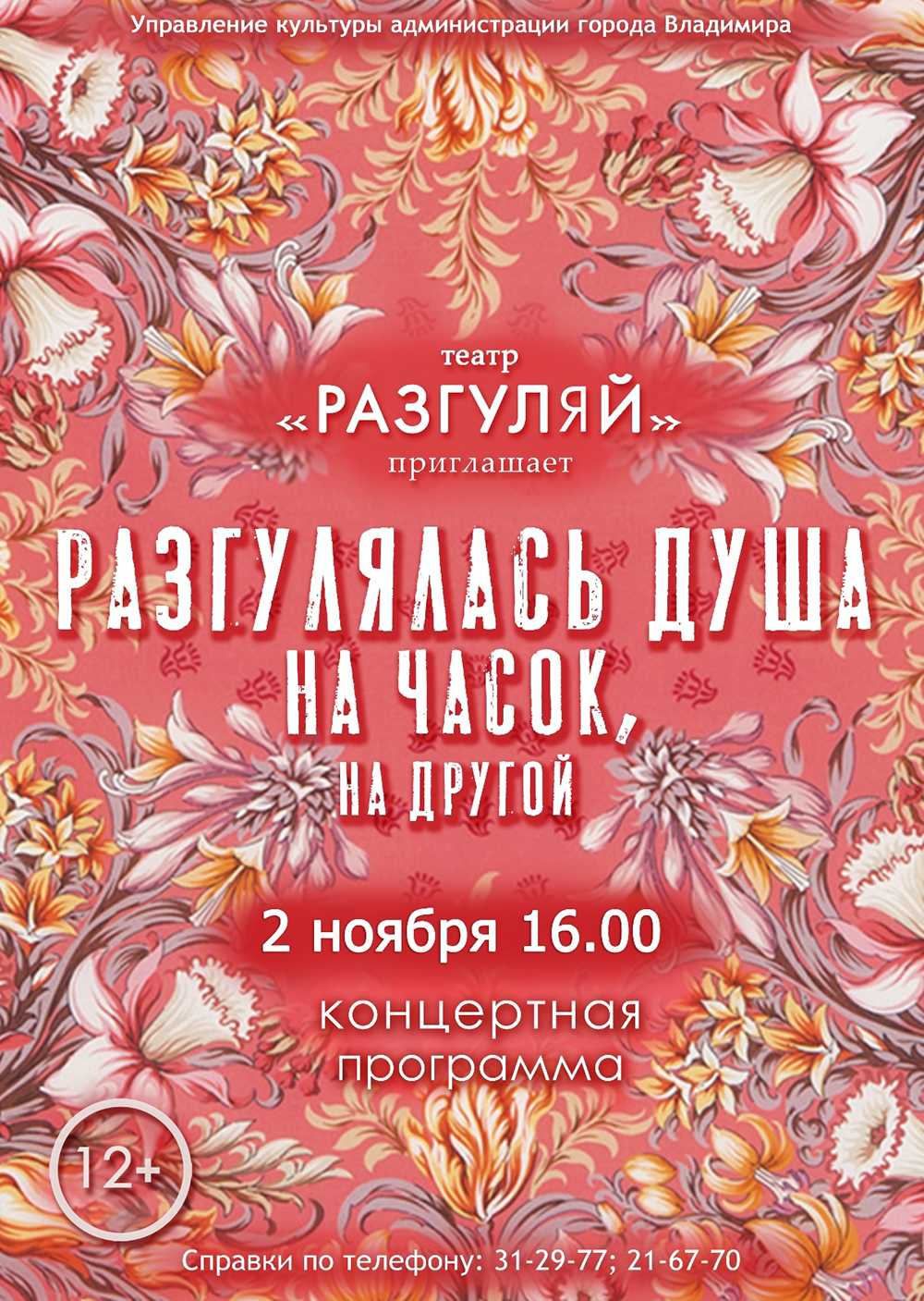 Концерты во Владимире Концертная программа «Разгулялась душа на часок, на другой»02 ноября 2025 в 16:00 Душа просит праздника? Мы знаем, как её порадовать! Музыкальный Театр «Разгуляй приглашает вас на концертную программу — «Разгулялась душа на часок, на другой»! Само название говорит за себя: это будет настоящий заряд тепла, душевности и красоты, окутанный мелодиями народной музыки. Что вас ждёт? • Любимые песни: артисты театра исполнят как трогательные лирические композиции, так и задорные, шуточные хиты, которые вы знаете и любите; • Настоящие эмоции: мы подарим вам незабываемую атмосферу единения, наполненную яркими красками знакомых мелодий и искренними, живыми чувствами. Позвольте себе отвлечься от суеты и просто насладиться моментом, когда душа поёт! Цена билета: 500 руб. Билеты уже в продаже: https://quicktickets.ru/vladimir-teatr-razgulyaj/s534 Дата: 02 ноября 2025 Начало: в 16.00 Место проведения: Музыкальный театр «Разгуляй Адрес: г. Владимир, ул. Добросельская, д. 194А Информация с https://vk.com/wall-96009189_1718 « вернуться владимирская афиша другие концерты во Владимире |