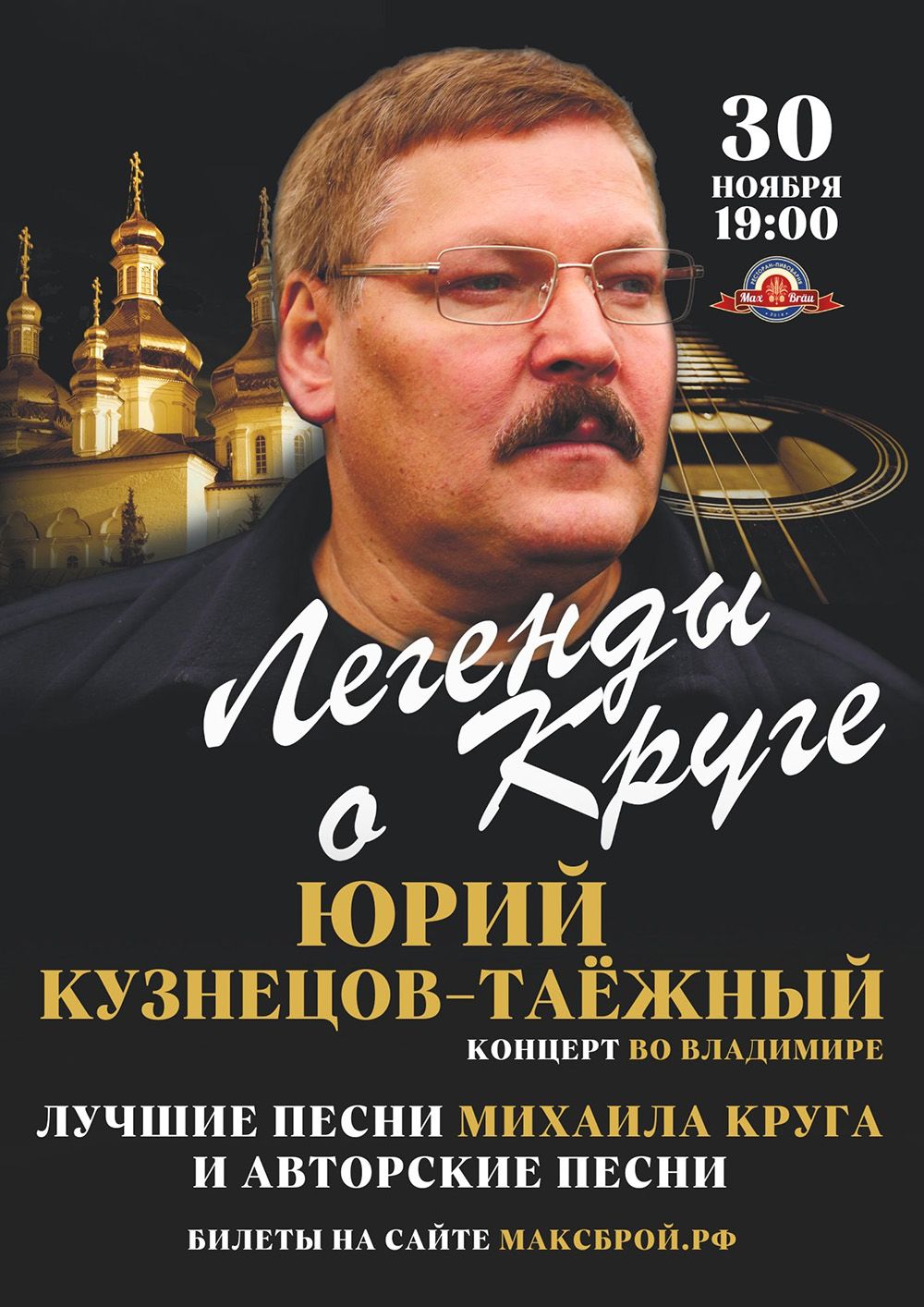 Концерты во Владимире Сольный концерт Юрия Кузнецова-Таёжного30 ноября 2025 в 19:00 Концерт Юрия Кузнецова-Таёжного во Владимире! 30 ноября в ресторане «Макс Брой» вас ждёт уникальное событие — большой сольный концерт Юрия Кузнецова-Таёжного, актёра, композитора, исполнителя и продюсера, исполнившего роль Михаила Круга в фильме «Легенды о Круге». На сцене прозвучат легендарные песни Михаила Круга — «Владимирский централ», «Магадан», «Золотые купола» и другие любимые хиты. Также Юрий представит свои авторские композиции, в числе которых — песня «Омуты», удостоенная премии «Шансон года» в Государственном Кремлёвском Дворце, и трек «Голуби». Концерт Юрия Кузнецова-Таёжного — это всегда особая энергетика и неповторимая атмосфера. Артист не только исполнит песни, но и расскажет истории о Михаиле Круге, поделится воспоминаниями о работе над фильмом «Легенды о Круге» и покажет самые интересные эпизоды. 14 мая у Юрия вышел новый альбом, включающий 22 трека. На концерте во Владимире вы сможете услышать некоторые из свежих песен в живом исполнении. После концерта состоится автограф-сессия и фотосессия — у вас будет возможность лично пообщаться с артистом и забрать с собой памятные снимки. 30 ноября 19:00 Юрий Кузнецов-Таёжный во Владимире Билеты: https://clck.ru/3PYdMc Не упустите шанс услышать легенды русского шансона в живом исполнении! Место: ресторан-пивоварня «Макс Брой» Адрес: г. Владимир, ул. Дзержинского, 11, 2 этаж Информация с https://vk.com/wall-77563659_20926 « вернуться владимирская афиша другие концерты во Владимире |