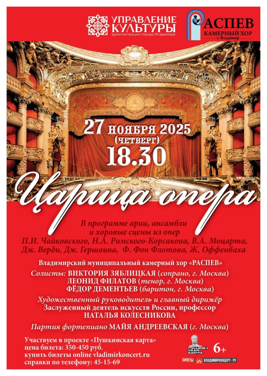 Концерты во Владимире Концерт «Царица опера»27 ноября 2025 в 18:30 Каждые два года камерный хор "Распев" балует своих постоянных слушателей яркими программами Проекта "Царица опера". Очередной концерт цикла состоится в ноябре 2025 года. Концертная программа обещает быть яркой и запоминающейся. Со сцены Большого зала Центра Культуры и Искусства на Соборной прозвучат известные и редко исполняемые во Владимире фрагменты опер и оперетт В.А. Моцарта и Г. Доницетти, Дж. Верди, Ж. Оффенбаха и Дж. Гершвина, Н.А. Римского-Корсакова и П.И. Чайковского. Своим искусством публику порадуют талантливые молодые приглашённые солисты: полюбившиеся владимирской публике - Виктория Зяблицкая (сопрано) и Леонид Филатов (тенор), и впервые приглашённый для участия в проекте Фёдор Дементьев (баритон). За дирижёрским пультом бессменный руководитель муниципального камерного хора "Распев" Заслуженный деятель искусств России, профессор Наталья Колесникова. За роялем – лауреат международных конкурсов Майя Андреевская. Цена: 500 руб. Билеты по ссылке: https://vk.cc/cQXnxw Дата: 27 ноября 2025 Начало: в 18.30 Место проведения: Центр культуры и искусства на Соборной Адрес: г. Владимир, ул. Большая Московская, 33/35 Справки по тел.: 8 (4922) 45-15-69 Информация с https://vk.com/wall-30929449_4658 « вернуться владимирская афиша другие концерты во Владимире |