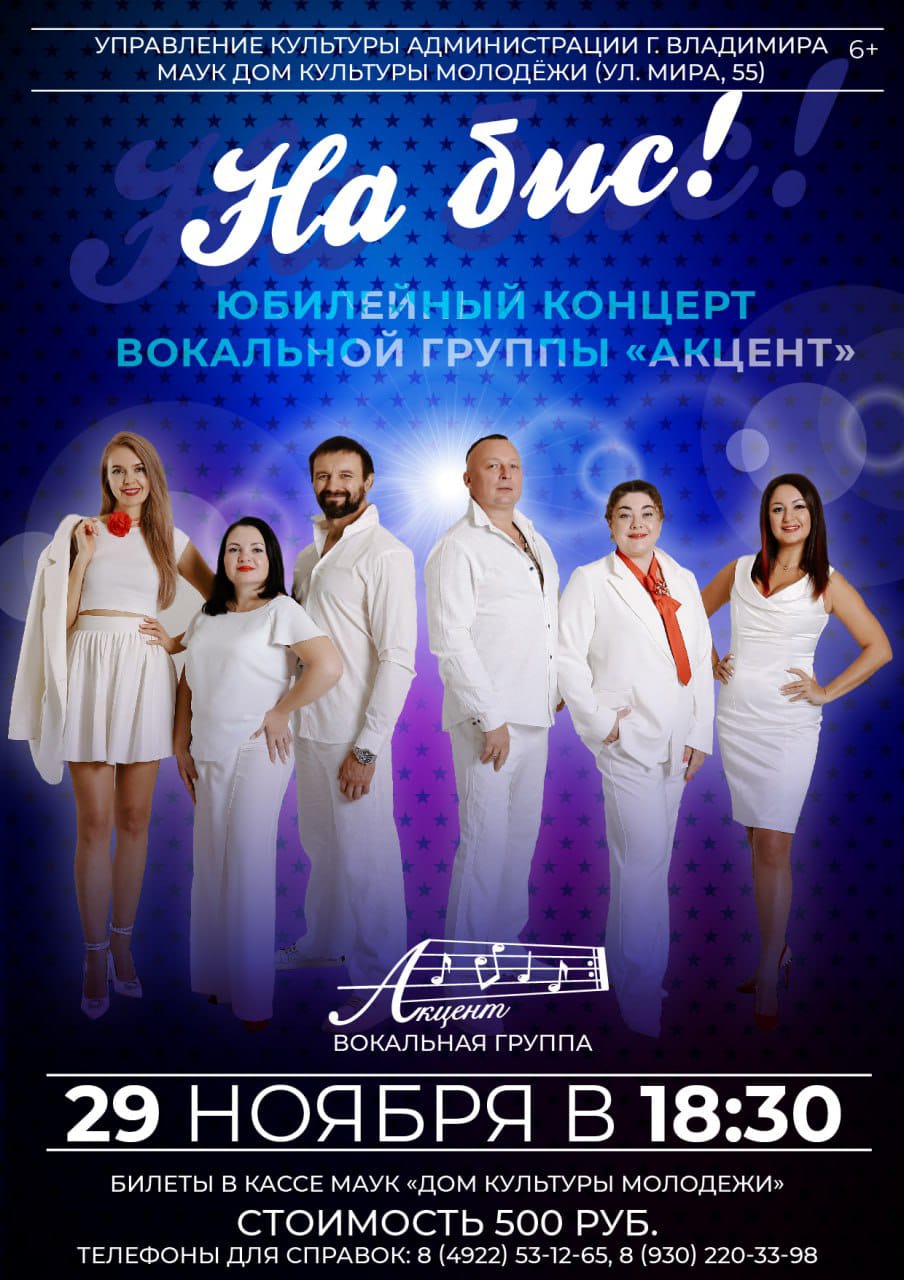 Концерты во Владимире Концерт группы «Акцент»29 ноября 2025 в 18:30 Это событие станет ярким и незабываемым моментом в культурной жизни нашего города Вокальная группа "Акцент" была создана в сентябре 2022 года людьми, объединенными любовью к музыке и искусству. За эти годы коллектив завоевал сердца тысяч слушателей, стал лауреатом многочисленных конкурсов и фестивалей, а также постоянным участником городских и международных мероприятий. В программа концерта: - Золотые хиты коллектива - Новые композиции и экспериментальные номера - Специальные сюрпризы для самых преданных поклонников Уникальная возможность увидеть и услышать лучшие номера за всю историю коллектива Не упустите шанс стать частью этого грандиозного события. Цена билета: 500 руб. Билеты по ссылке: https://quicktickets.ru/vladimir-dk-molodyozhi/s490 Дата: 29 ноября 2025 Начало: в 18.30 Место проведения: Дом культуры молодёжи Адрес: Владимир, ул. Мира, д. 55 Информация с https://vk.com/dkmvladimir « вернуться владимирская афиша другие концерты во Владимире |