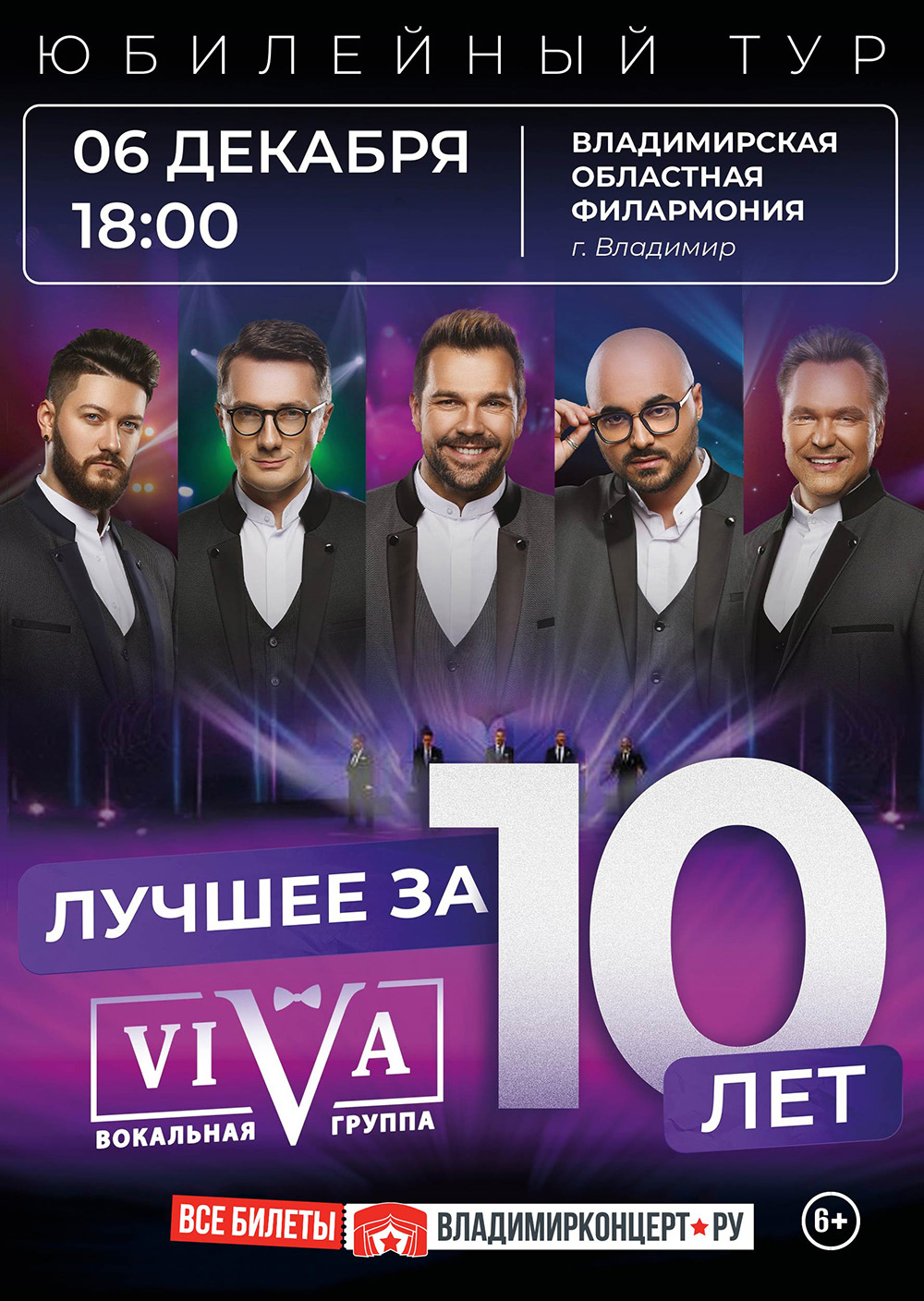 Концерты во Владимире Вокальная группа «ViVA» с юбилейной программой «Лучшее за 10 лет» (6+)06 декабря 2025 в 18:00 В 2025 году группа ViVA отмечает важную дату – 10 лет ярких выступлений, незабываемых эмоций и музыкальных открытий. Приглашаем Вас на юбилейный концерт «Лучшее за 10 лет» и разделить с нами этот важный момент в нашей истории. В честь юбилейной даты группа ViVA подготовила уникальную программу, которая объединит лучшее за годы творческой деятельности: всеми любимые хиты, стихи и рассказы, премьеры песен, интерактив со зрителем, все то, что вдохновляет, мотивирует и заставляет окунуться в другую реальность. Юбилейный концерт «Лучшее за 10 лет» – это вечер, который нельзя пропустить. Не упустите свой шанс стать частью этого незабываемого события! Продолжительность: 1,5 часа без антракта Цена билета: 1400-2700 руб. Билеты на концерт можно приобрести в кассе филармонии и онлайн по ссылке: https://vk.cc/cR15YI Дата: 06 декабря 2025 Начало: в 18.00 Место проведения: Владимирская областная филармония Адрес: г. Владимир, проспект Ленина, дом 1 Информация с http://www.vladfilarmonia.ru/afisha/concerts-in-vladimir/vokalnaya-gruppa-viva-s-yubileynoy-programmoy-luchshee-za-10-let/ « вернуться владимирская афиша другие концерты во Владимире |