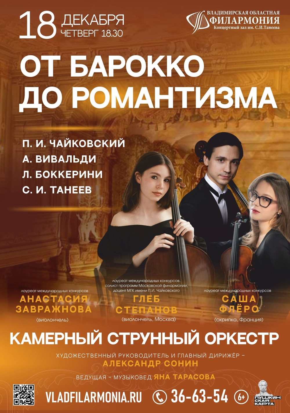 Концерты во Владимире Камерный струнный оркестр с программой «ОТ БАРОККО ДО РОМАНТИЗМА»18 декабря 2025 в 18:30 В программе прозвучат произведения А. Вивальди, Л. Боккерини, С.И. Танеева, П.И.Чайковского и других известных композиторов. Познакомимся поближе с участниками и солистами концерта. Исполнители: Художественный руководитель и главный дирижёр Камерного струнного оркестр – Александр СОНИН Дирижёр - Ирина КОПАЧЁВА-КУРОВСКАЯ (г. Москва) Ведущая – музыковед Яна ТАРАСОВАСолисты - лауреаты международных конкурсов: Глеб СТЕПАНОВ (виолончель, г. Москва) Анастасия ЗАВРАЖНОВА (виолончель) Саша ФЛЁРО (скрипка, Франция) Глеб СТЕПАНОВ окончил МГК им. П.И.Чайковского и ассистентуру-стажировку в классе народной артистки СССР, профессора Н.Г.Гутман. Во время учебы в Московской консерватории стал победителем международных конкурсов в Москве, Владивостоке, Бари (Италия), Париже (Франция). Солист программ Московской государственной академической филармонии, участник проектов «Звезды XXI века» и «Всероссийские филармонические сезоны». В настоящее время – доцент Московской государственной консерватории им. П.И.Чайковского. Играет на виолончели Пьетро Мантегацца (Италия, Милан 1721 г.) из Госколлекции. Анастасия ЗАВРАЖНОВА в 2020 г. окончила МОМК им С.С.Прокофьева, класс И.В.Бурцева. В настоящее время студентка МГК имени П.И.Чайковского, класс доцента Г.К.Степанова. Выступала на сцене Большого, Малого и Рахманиновского зала Московской консерватории и других крупных концертных площадках в городах России. Саша ФЛЁРО (скрипка, Франция) в 2024г окончила АМУ при МГК им. П. И. Чайковского ,класс народного артиста СССР, профессора Э.Д. Грача. В настоящее время студентка МГК им. П. И. Чайковского, класс доцента Г. Б. Акинфина, ассистента Э.Д.Грача. Лауреат Всероссийских и Международных конкурсов. Участница образовательных программ в Сириусе.Стипендиат Международного Благотворительного Фонда Владимира Спивакова. Продолжительность: 2 часа с антрактом Цена билета: 600-800 руб. Доступно приобретение билетов по Пушкинской карте Дата: 18 декабря 2025 Начало: в 18.30 Билеты на концерт можно приобрести в кассе филармонии и онлайн по ссылке: https://iframeab-pre10088.intickets.ru/seance/65750442 Место проведения: Владимирская областная филармония Адрес: г. Владимир, проспект Ленина, дом 1 Информация с http://www.vladfilarmonia.ru/afisha/concerts-in-vladimir/kamernyy-strunnyy-orkestr-s-programmoy-ot-barokko-do-romantizma/ « вернуться владимирская афиша другие концерты во Владимире |