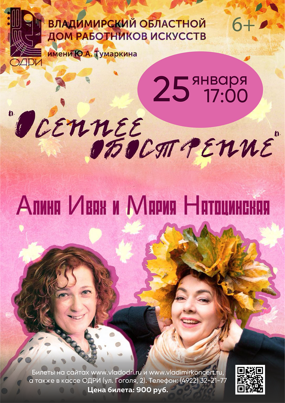 Концерты во Владимире Концерт Алины Ивах и Марии Натоцинской25 января 2026 в 17:00 Концерт перенесен с 16 ноября на 25 января. Очередной концерт полюбившегося владимирцам творческого дуэта — Марии Натоцинской и Алины Ивах (г.Москва). Алина Ивах(вокал), неоднократный призер всероссийского конкурса «Поют драматические актеры». Актриса Московского губернского театра. Мария Натоцинская (фортепиано) — концертмейстер Российской Академии Музыки им Гнесиных. Цена билета: 900 руб. Билеты по ссылке: https://vk.cc/cR8iZc Дата: 25 января 2025 Начало: в 17.00 Место проведения: Владимирский областной Дом работников искусств Адрес: г. Владимир, ул. Гоголя, 2 Информация с https://vladodri.ru/events/koncert-aliny-ivah-i-marii-natocinskoj-3/ « вернуться владимирская афиша другие концерты во Владимире |
