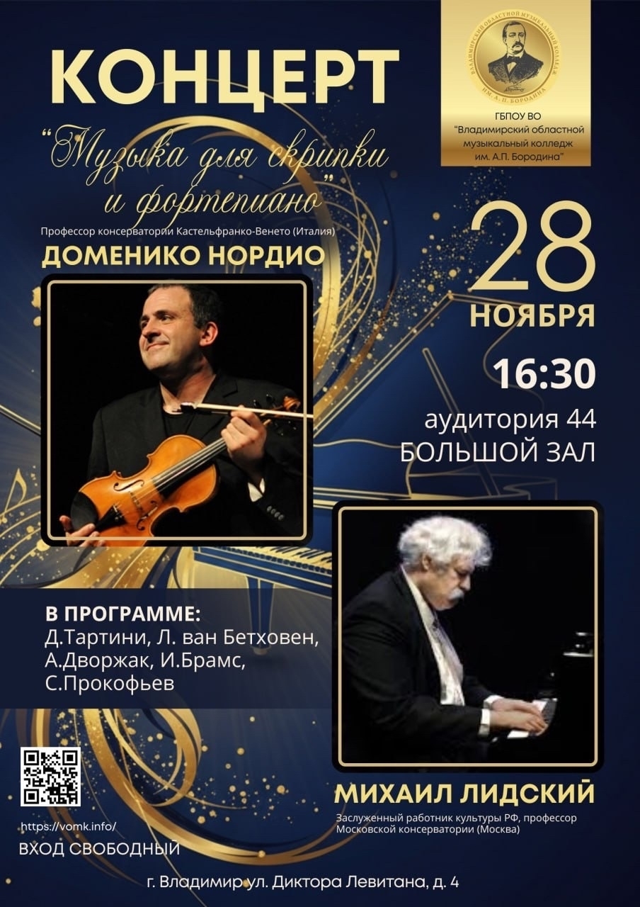 Концерты во Владимире Михаил ЛИДСКИЙ и Доменико НОРДИО28 ноября 2025 в 16:30 Творческое содружество одного из ведущих скрипачей Италии Доменико Нордио (род. 1971) и выдающегося российского пианиста Михаила Лидского (род. 1968) выдержало испытание временем и расстоянием, как остроумно заметил недавно журналист. Звездный дуэт выступает в разных странах почти четверть века, а ежегодные гастроли по России стали доброй традицией. По мнению критики, «встреча таких мастеров, каждый из которых представляет масштабную самостоятельную творческую индивидуальность, дает “на выходе” высочайшее качество, искусство – поразительно тонкое и разнообразное, логичное и истинное». Доменико Нордио – один из ведущих музыкантов Италии. Уже почти двадцать лет наши слушатели аплодируют итальянскому гостю, ценя его как глубокого музыканта и скрипача-виртуоза. Маэстро Нордио (род. 1971) дал свой первый концерт в возрасте 10 лет, еще вундеркиндом. Затем были победы на конкурсах, жюри которых возглавляли Иегуди Менухин и Зино Франческати. Концерты по всему миру, записи, преподавательская деятельность (в настоящее время маэстро Нордио – профессор консерватории Кастельфранко-Венето). Михаил Лидский – заслуженный работник культуры РФ, профессор Московской государственной консерватории им. П.И. Чайковского – принадлежит к элите российского пианизма. Музыкант активно концертирует в течение нескольких десятилетий, завоевав славу глубокого, оригинального интерпретатора и блестящего виртуоза, владеющего огромным репертуаром. Ждём Вас, дорогие слушатели на наших концертах! Вход СВОБОДНЫЙ Дата: 28 ноября 2025 Начало: в 16.30 Место проведения: Большой зал ВОМК им. А.П. Бородина (ауд. 44) Адрес: г. Владимир, ул. Диктора Левитана, д. 4 Информация с https://vk.com/wall-3699295_10870 « вернуться владимирская афиша другие концерты во Владимире |