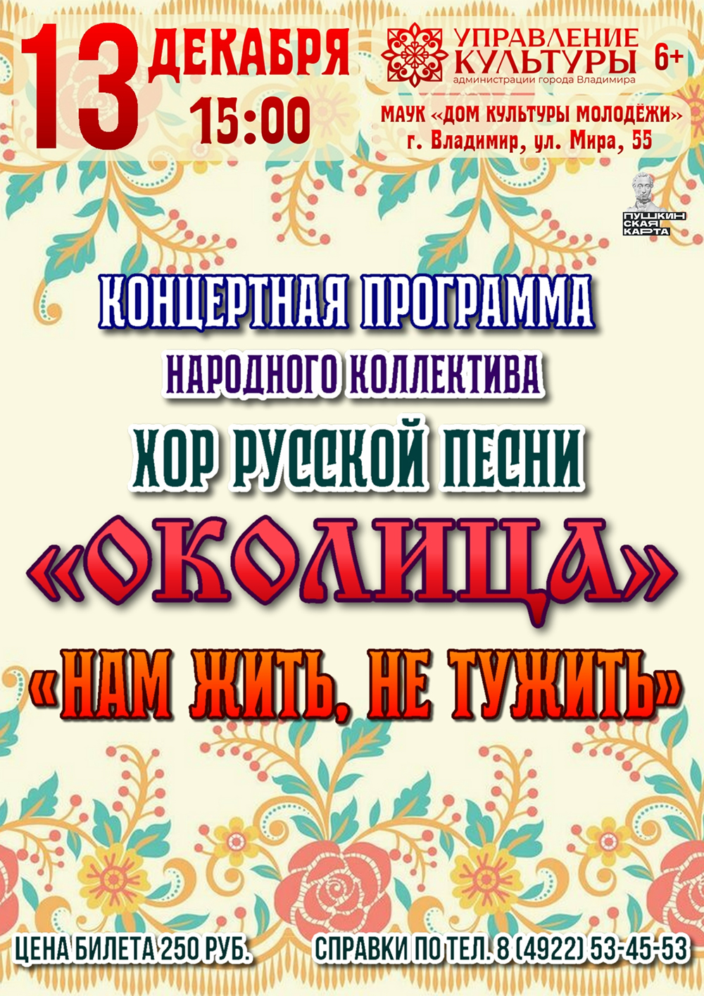 Концерты во Владимире Концерт хора русской песни «Околица»13 декабря 2025 в 15:00 «ДОМ КУЛЬТУРЫ МОЛОДЁЖИ» приглашает всех любителей русской песни на концерт Народного коллектива Хора русской песни «Околица». Новая программа посвящена любви во всем ее многогранном понятии. Любви к зрителям, Родине, Владимирскому краю и народным песням. В программе прозвучат песни о любви к родине, родным и близким, о любви к зрителю и, конечно, о бесконечной любви к русской песне. Хор исполнит любимые зрителями свадебные, величальные, шуточные, плясовые, хороводные, игровые песни. Также выступят гармонистка Екатерина Миронова – неоднократная участница передачи «Играй, гармонь» и ансамбль казачьей песни «Раздолье». Цена билета: 250 рублей Действует Пушкинская карта Билеты уже в продаже: https://quicktickets.ru/vladimir-dk-molodyozhi/s523 Дата: 13 декабря 2025 Начало: в 15.00 Место проведения: Дом культуры молодёжи, концертный зал Адрес: Владимир, ул. Мира, д. 55 Информация с https://vk.com/wall-51317454_10343 « вернуться владимирская афиша другие концерты во Владимире |