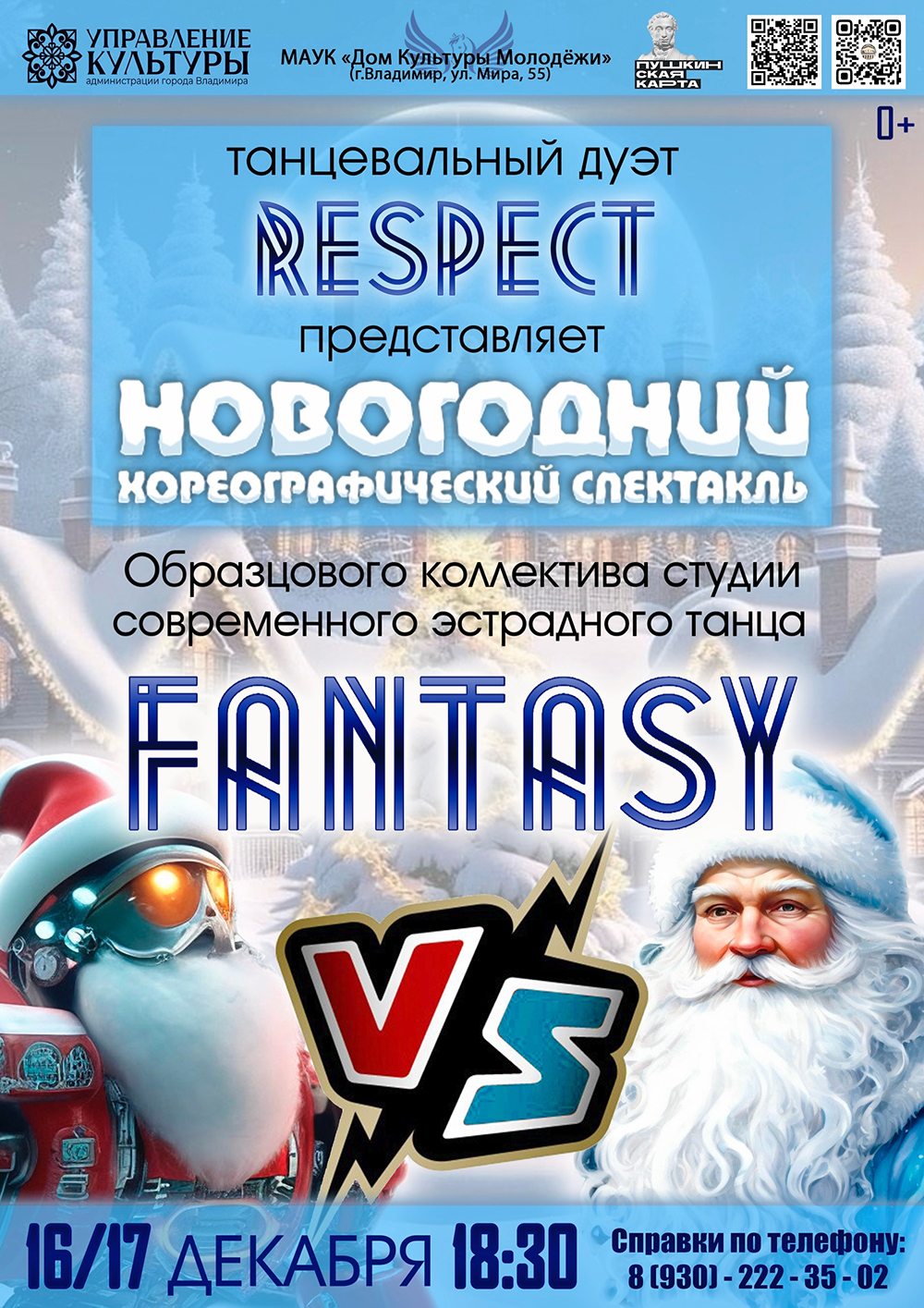 Концерты во Владимире Новогодний хореографический концерт-спектакль «VS»16 декабря 2025 в 18:30 Впереди главный волшебный праздник — Новый год! И как же обойтись без приключений в преддверии зимнего чуда? В нашем мире всё постепенно становится современным: даже еду нам доставляют роботы. Вот и авторы нашей истории решили создать роботизированного Деда Мороза. Чем это закончится и сможет ли он заменить чудесного волшебника, вы узнаете 16 и 17 декабря в 18:30 в Доме культуры молодежи! Сказка не только подарит предновогоднее настроение взрослым и детям, но и напомнит о семейных ценностях, уюте, вере в чудеса и волшебство. Студия танца «Fantasy» ждёт вас на свой пятый фантастический новогодний хореографический концерт-спектакль «VS»! 🤍 Будет оооочень интересно! Стоимость билета — 450 рублей. Забронировать билеты можно по телефону: 8 (930) 222-35-02. Дата: 16 и 17 декабря 2025 Начало: в 18.30 Место проведения: Дом культуры молодёжи, концертный зал Адрес: Владимир, ул. Мира, д. 55 Информация с https://vk.com/wall-52156207_2076 « вернуться владимирская афиша другие концерты во Владимире |