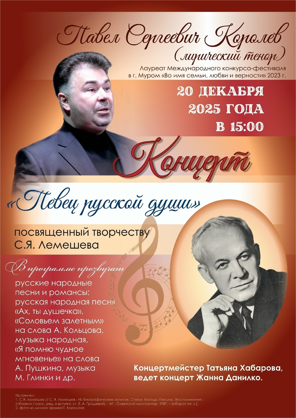 Концерты во Владимире Концерт «Певец русской души, посвященный творчеству Сергея Лемешева»20 декабря 2025 в 15:00 20 декабря 2025 года в 15:00 во Владимирской областной научной библиотеке состоится концерт владимирского артиста Павла Королева, посвященный творчеству советского оперного певца Сергея Яковлевича Лемешева «Певец русской души». Павел Сергеевич Королев – лирический тенор, окончил Нижегородскую консерваторию. Является концертмейстером народного хора русской песни «Околица» Дома культуры молодежи г. Владимира. Регулярно выступает на сцене Дома культуры молодежи в качестве солиста-вокалиста. Лауреат Международного конкурса-фестиваля в г. Муром «Во имя семьи, любви и верности» 2023 г. В концерте прозвучат русские народные песни и романсы: - русская народная песня «Ах, ты душечка»; - «Соловьем залетным» на слова А. Кольцова, музыка народная; - «Я помню чудное мгновенье» на слова А. Пушкина, музыка М. Глинки и др. Концертмейстер Татьяна Хабарова, ведет концерт Жанна Данилко. Ждем вас 20 декабря 2025 года в 15:00 по адресу: г. Владимир, ул. Дзержинского, д. 3. Телефон для справок: +7 (4922) 45-14-85 Вход свободный! Информация с https://library.vladimir.ru/rozhdestvenskie-nedeli-2025/koncert-pevec-russkoj-dushi-sergej-lemeshev.html « вернуться владимирская афиша другие концерты во Владимире |