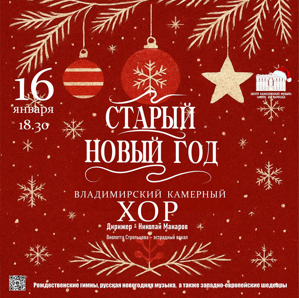 Концерты во Владимире Старый Новый год с Владимирским камерным хором16 января 2026 в 18:30 Концерт посвящен Дню артиста «Старый Новый Год» и одновременно новый творческий год для Владимирского камерного хора с новым художественным руководителем. Первый концерт в году это - рождественские гимны, русская новогодняя музыка, а также западно-европейские шедевры мировой классики, которые окутают вас теплом и уютом, верой в лучшее в наступившем году. В программе произведения В. Шебалина, Ю.Фалика, Г. Свиридова, Р. В. Уильямса,Э. Эшенвальдса и др. Солистка концерта - Виолетта СТРЕЛЬЦОВА (эстрадный вокал) Дирижер - Николай МАКАРОВ Дата: 16 января 2026 Начало концерта: в 18.30 Место: Центр классической музыки Билеты в кассе Центра классической музыки по адресу: ул. Большая Московская, 28 Ежедневно с 10:00 до 19:00 (14:00-15:00 перерыв на обед) Билеты по ссылке: https://vk.cc/cSSe1e Телефоны для справок: 8 (4922) 32-27-71; 32-63-65 Информация с https://vk.ru/wall-23958279_17694 « вернуться владимирская афиша другие концерты во Владимире |